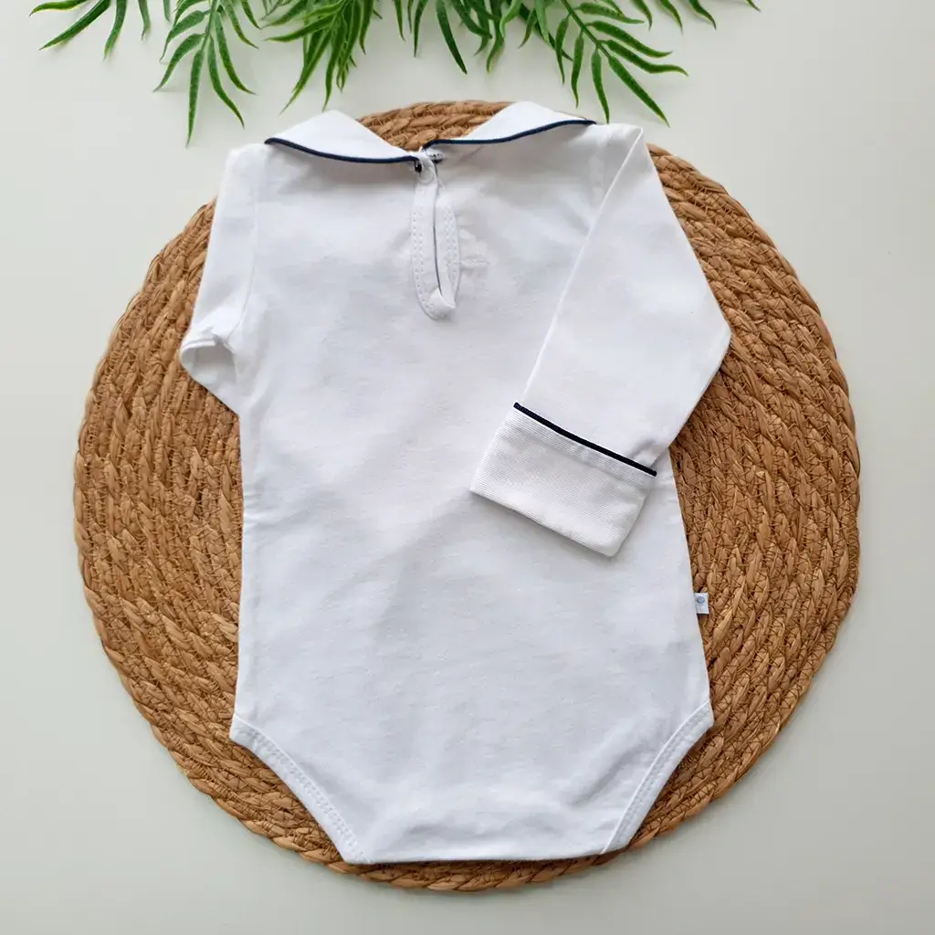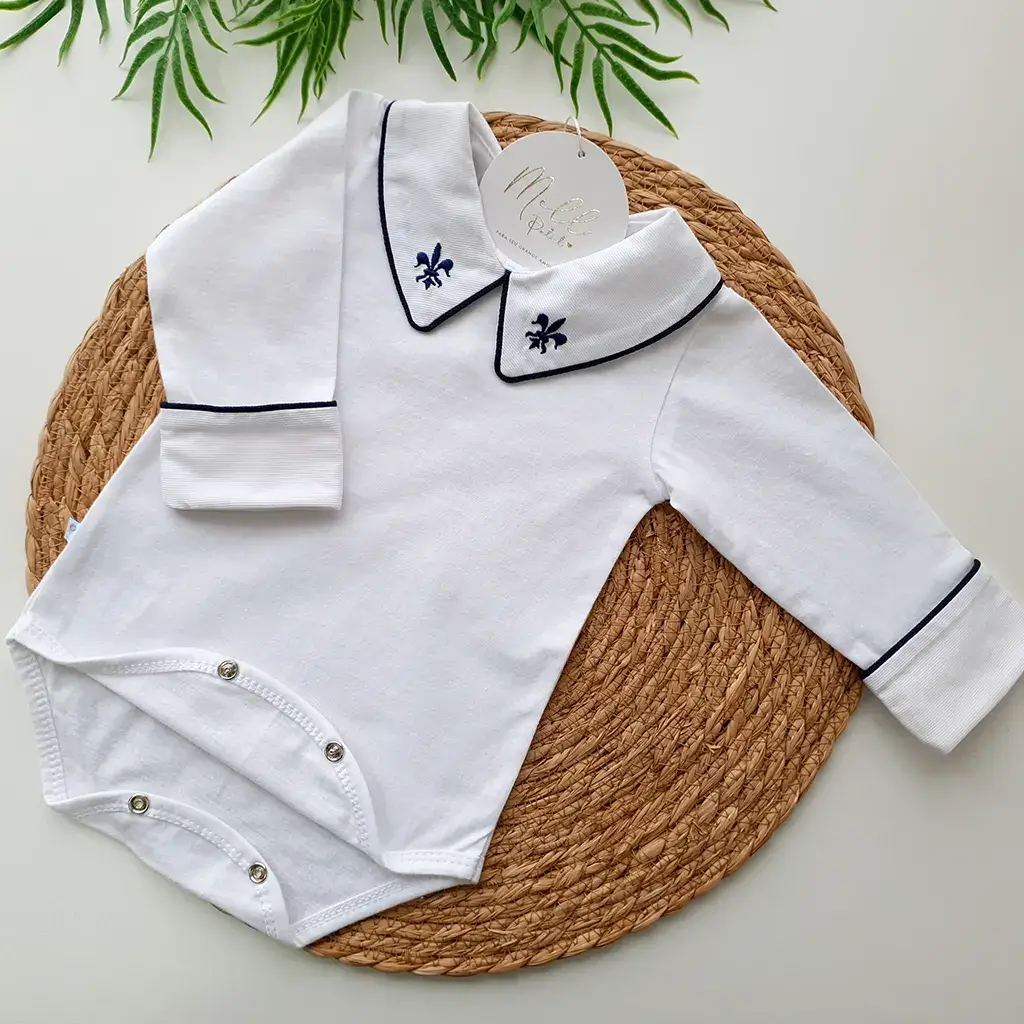 Pontos a destacar: a golinha bordada e punhos sobrepostos que destacam a delicadeza do viés em azul marinho. Suas aberturas por botões de pressão oferecem conforto para o bebê no momento da troca de fralda. É perfeita e uma linda combinação com a saída de maternidade.