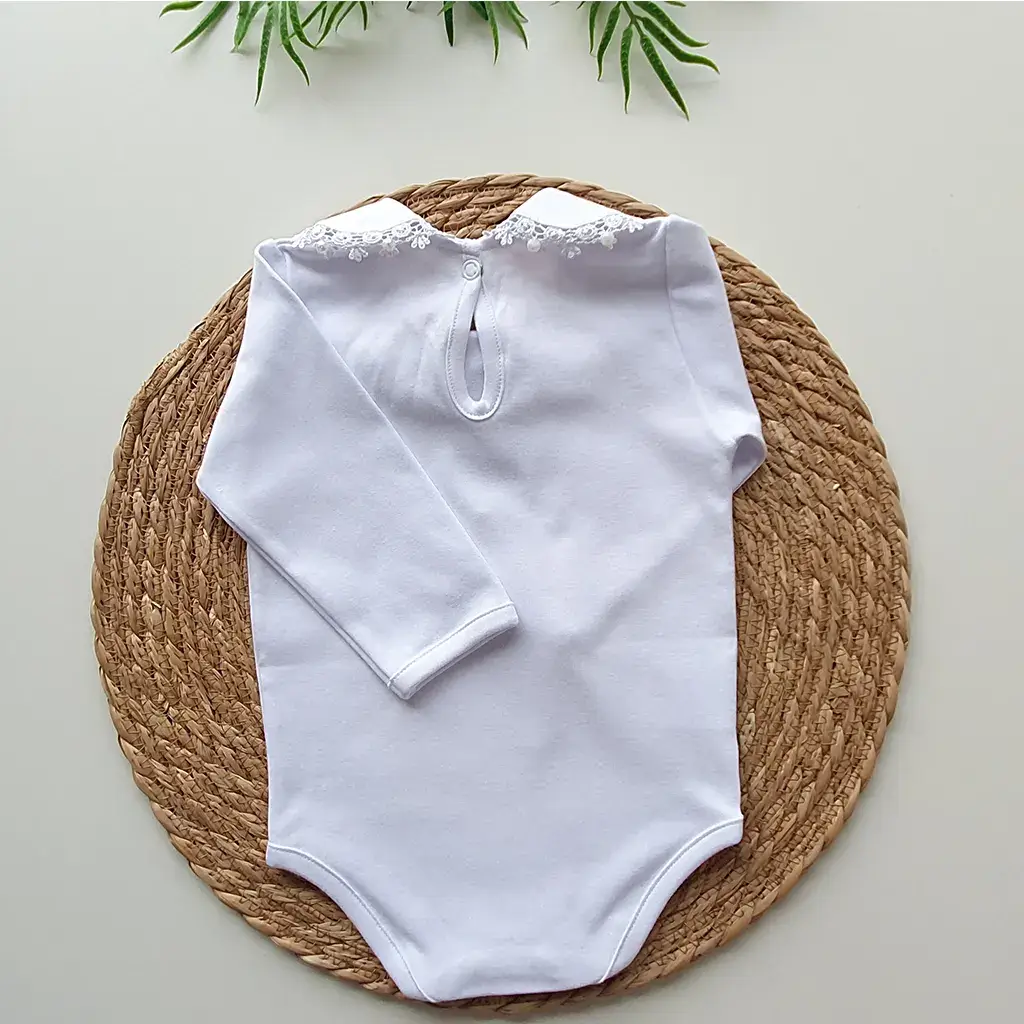 Pontos a destacar: a golinha bordada e punhos destacam a delicadeza da renda em guipir. Suas aberturas por botões de pressão oferecem conforto para o bebê no momento da troca de fralda. É perfeita e uma linda combinação com a saída de maternidade.