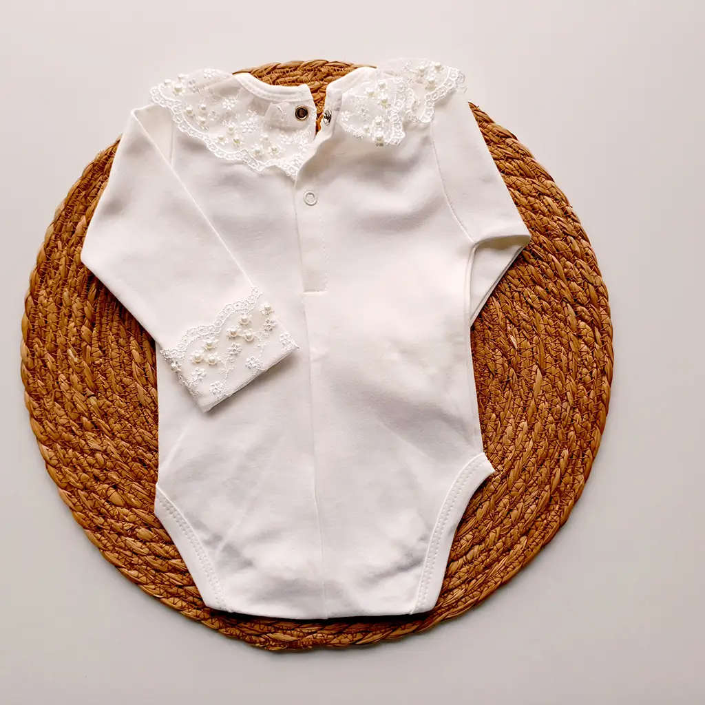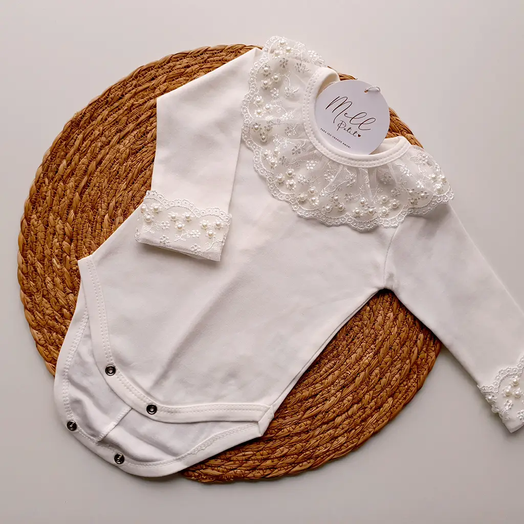 Pontos a destacar: a golinha e punhos sobrepostos que destacam a delicadeza da renda com mini pérolas. Suas aberturas por botões de pressão oferecem conforto para o bebê no momento da troca de fralda. É perfeita e uma linda combinação com a saída de maternidade.