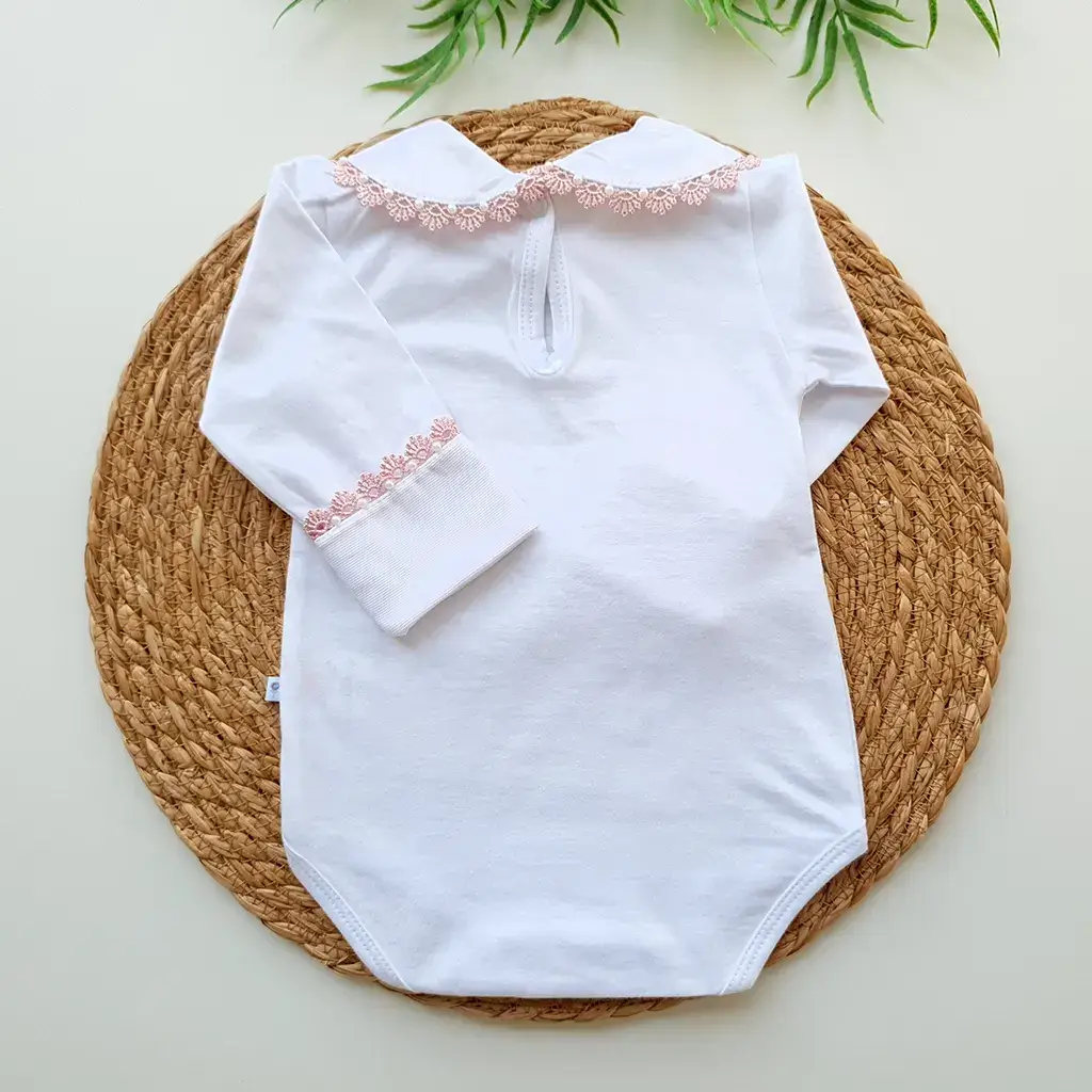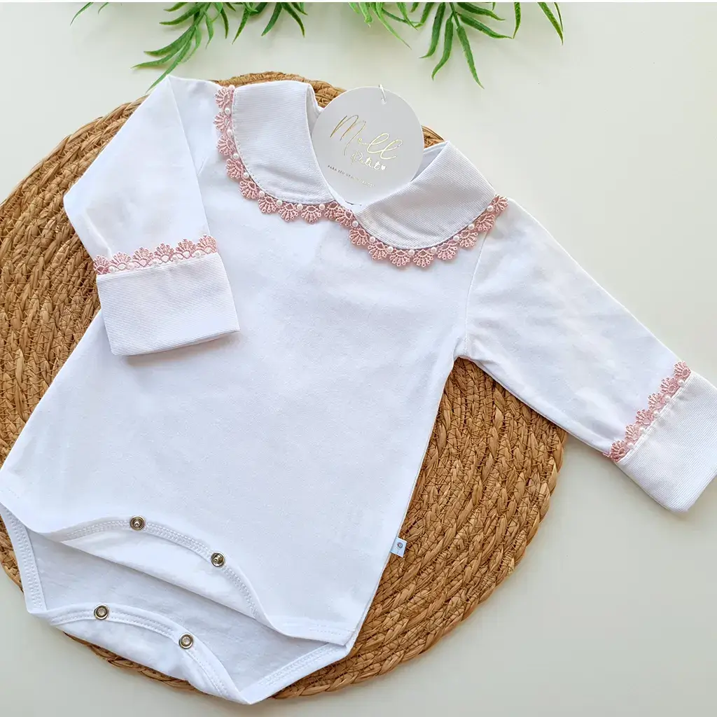 Pontos a destacar: a golinha e punhos sobrepostos que destacam a delicadeza da renda guipir com mini pérolas. Suas aberturas por botões de pressão oferecem conforto para o bebê no momento da troca de fralda. É perfeita e uma linda combinação com a saída de maternidade.