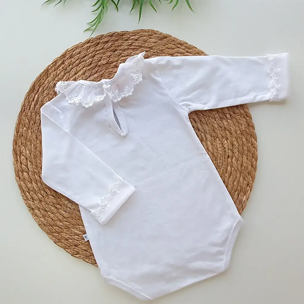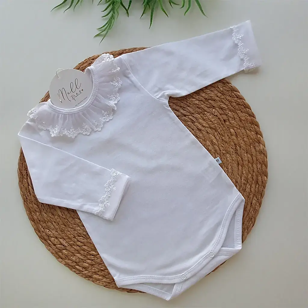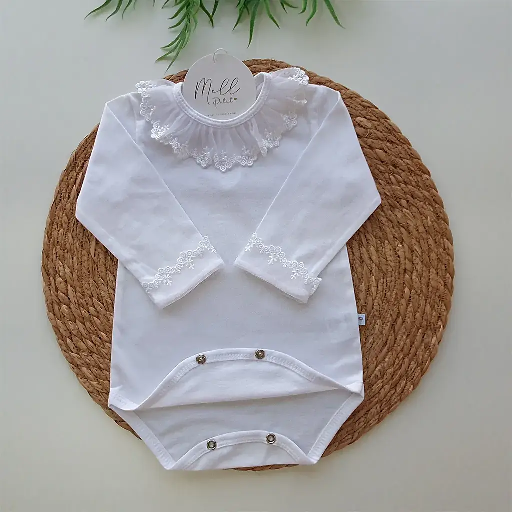 Pontos a destacar: a golinha e punhos sobrepostos que destacam a delicadeza da renda delicada com mini pérolas. Suas aberturas por botões de pressão oferecem conforto para o bebê no momento da troca de fralda. É perfeita e uma linda combinação com a saída de maternidade.