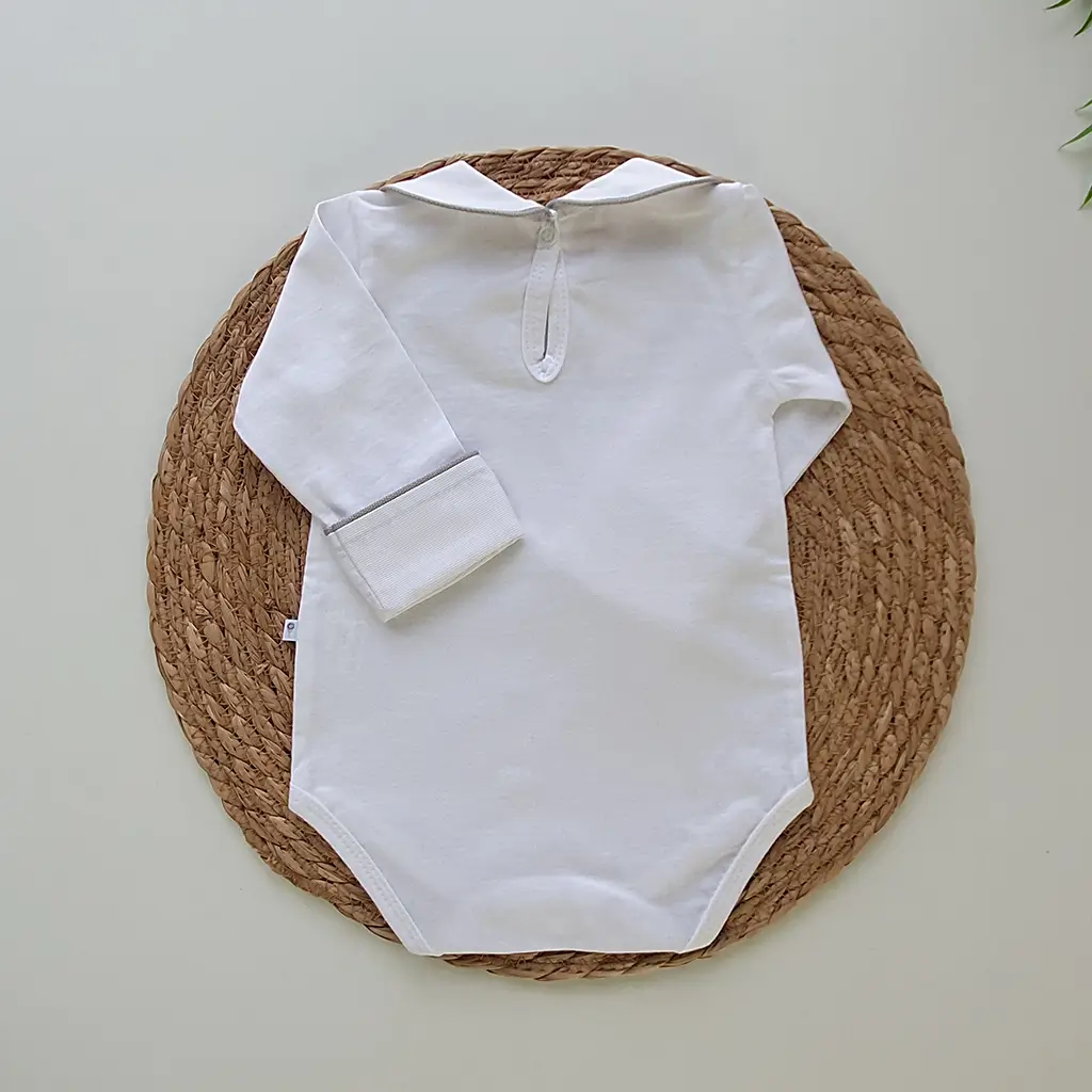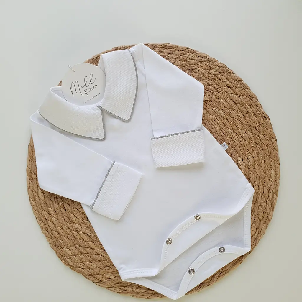 Pontos a destacar: a golinha e punhos sobrepostos que destacam a delicadeza do viés. Suas aberturas por botões de pressão oferecem conforto para o bebê no momento da troca de fralda. É perfeita e uma linda combinação com a saída de maternidade.