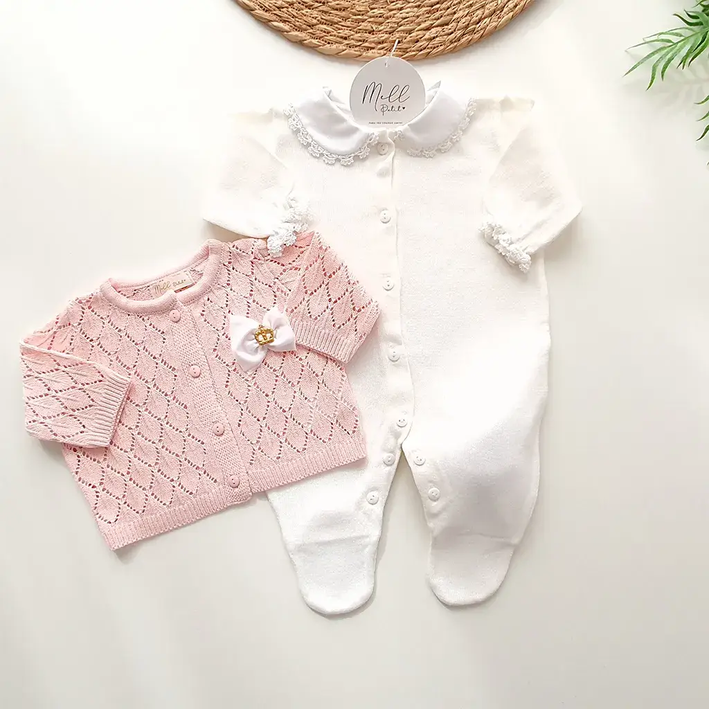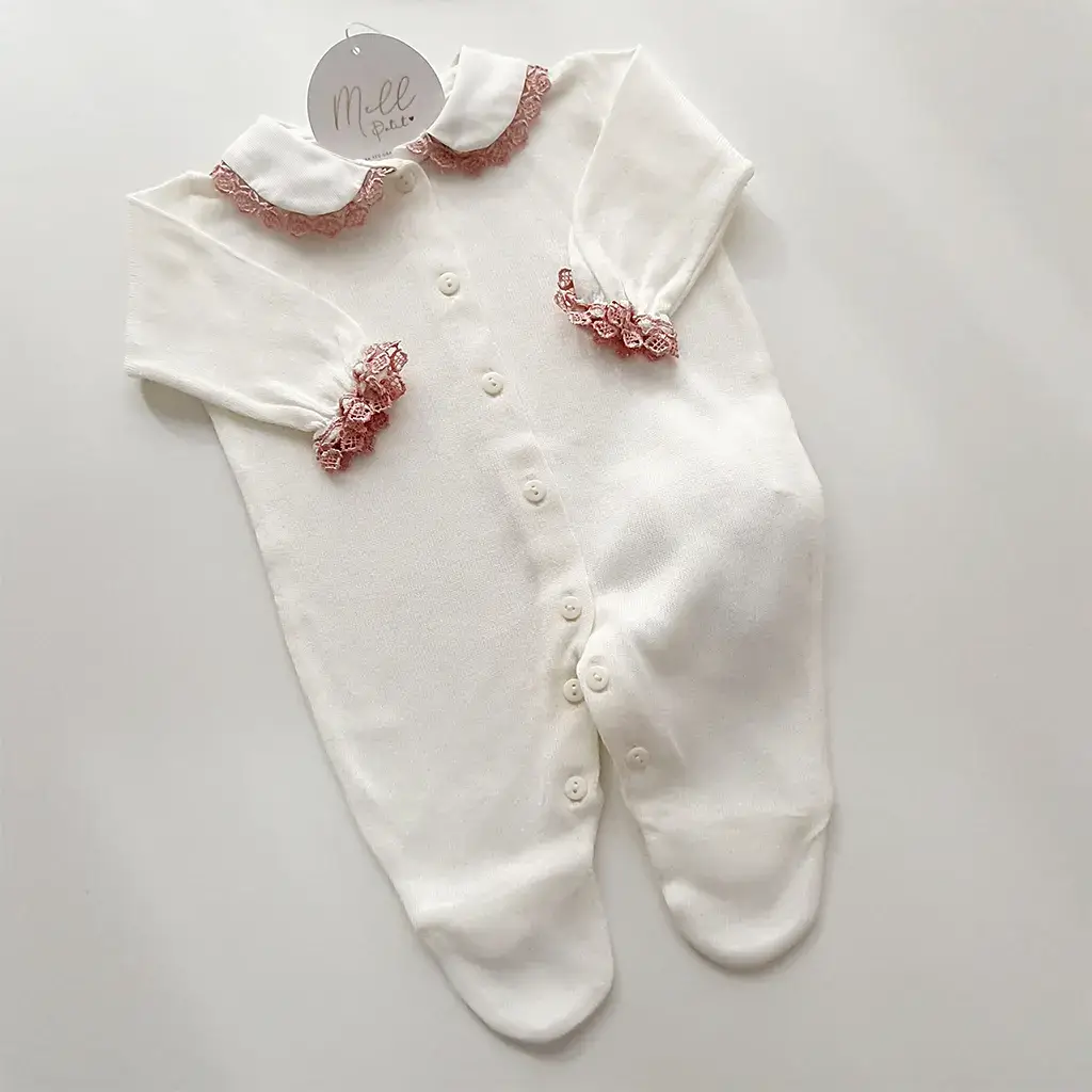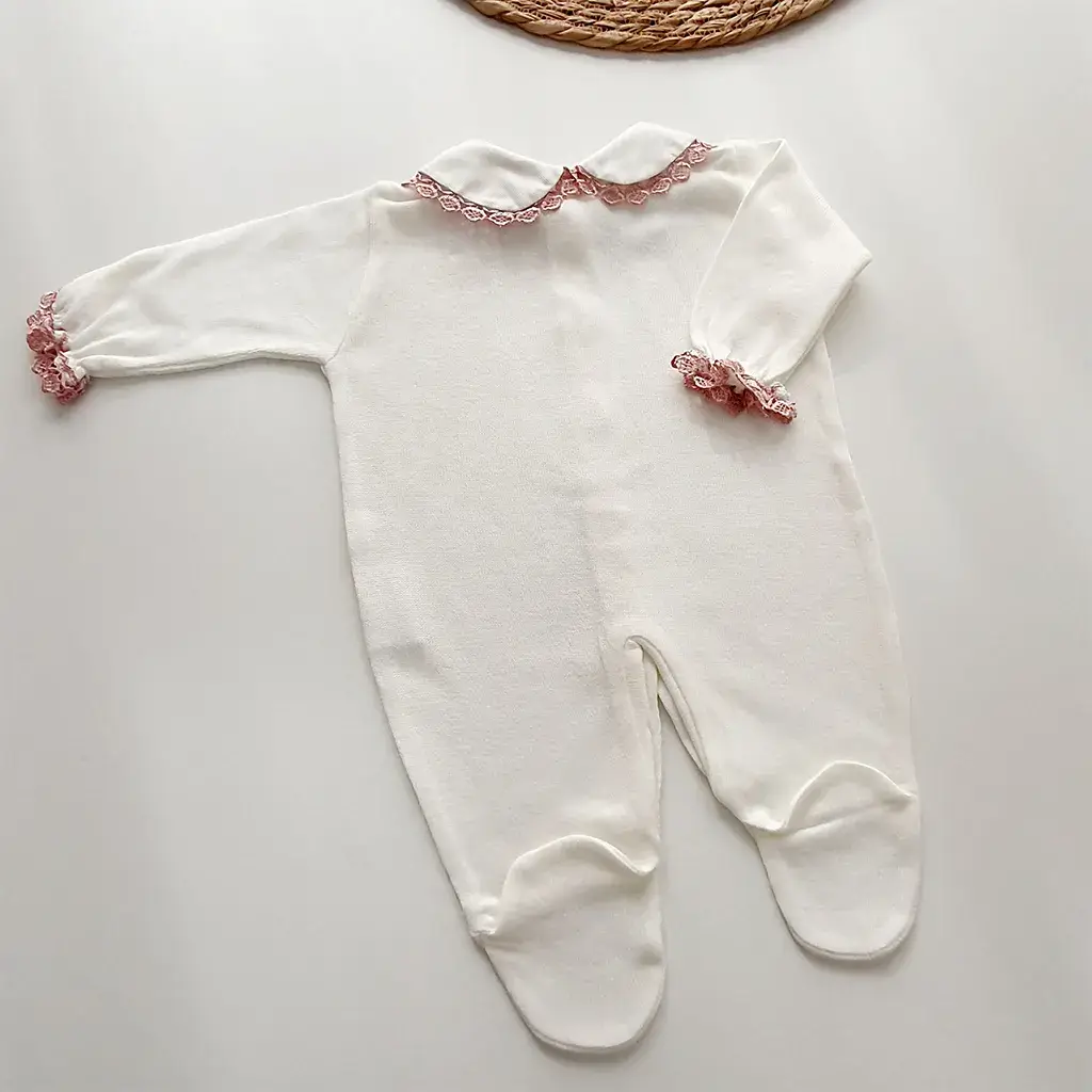 Macacão espessura leve com golinha e punhos em renda guipir, possui abertura frontal para facilitar a troca do bebê.