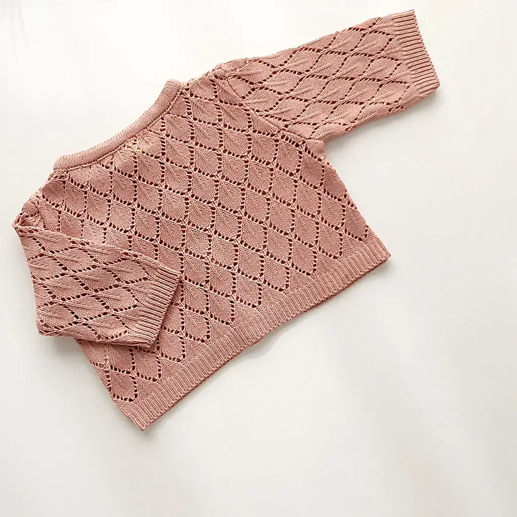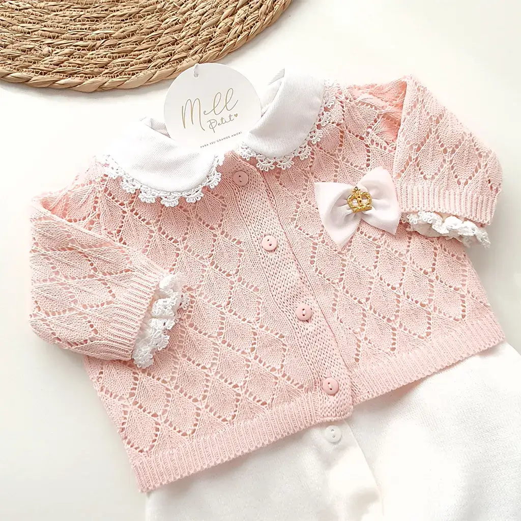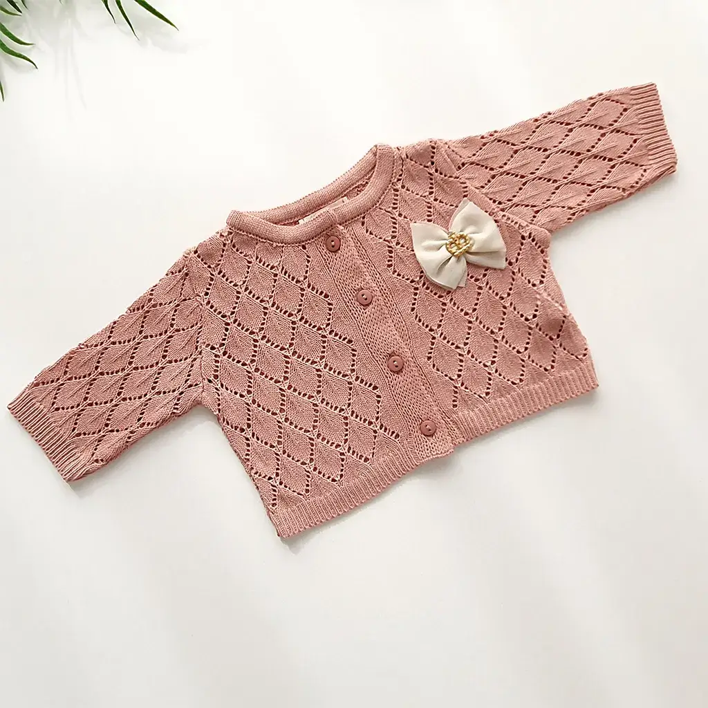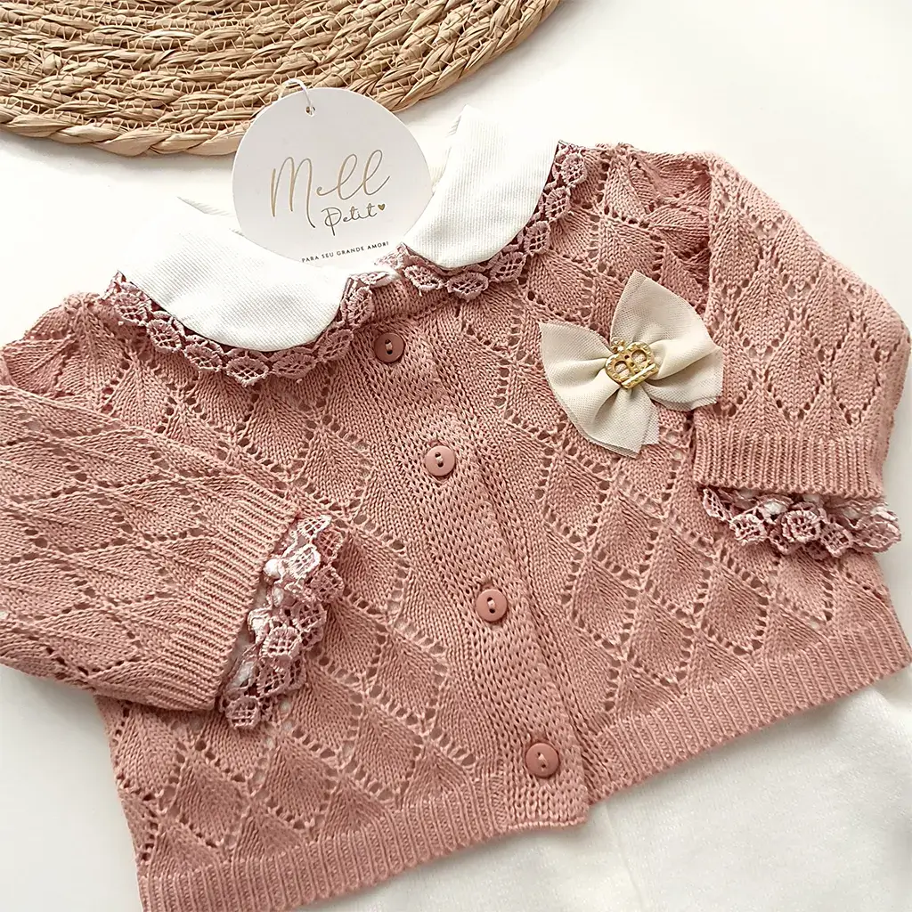 Casaquinho em tricot trama trabalhada com aplique e laço . Possui botões com abertura frontal.