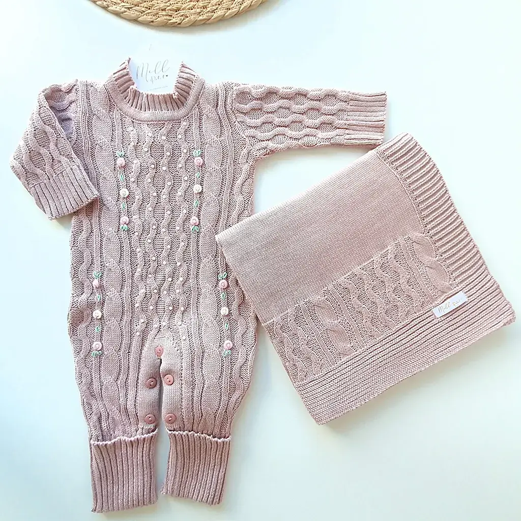 Macacão e manta coordenados com detalhe na trama. Possui acabamento em rococós e apliques de mini pérolas com abotoamento nas costas e entre as pernas para facilitar a troca da bebê.