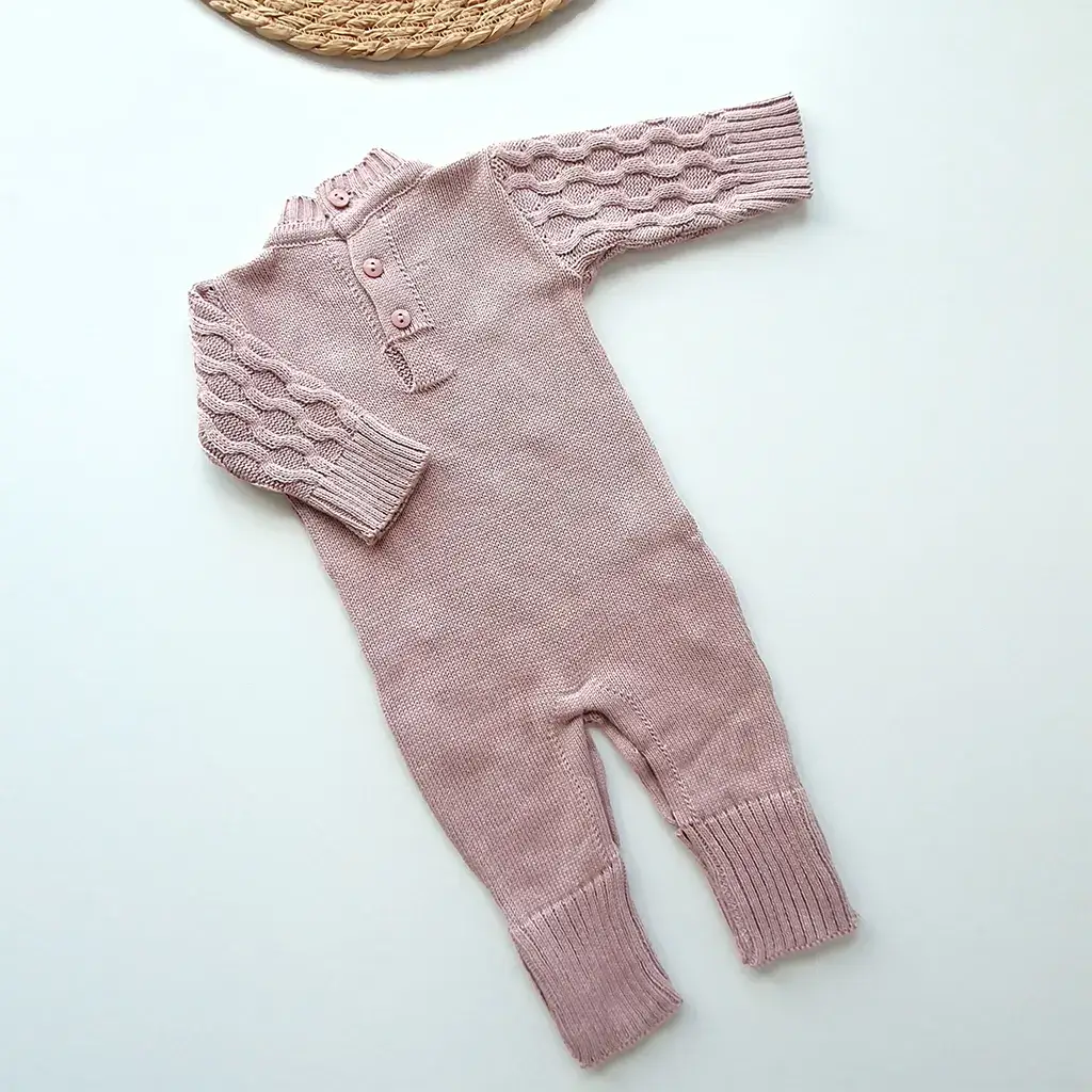 Manta de tricot lisa com a mesma cor e detalhes de trama do macacão, medindo aproximadamente: 80 x 80 cm.