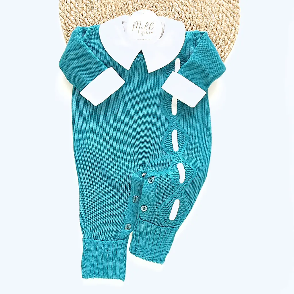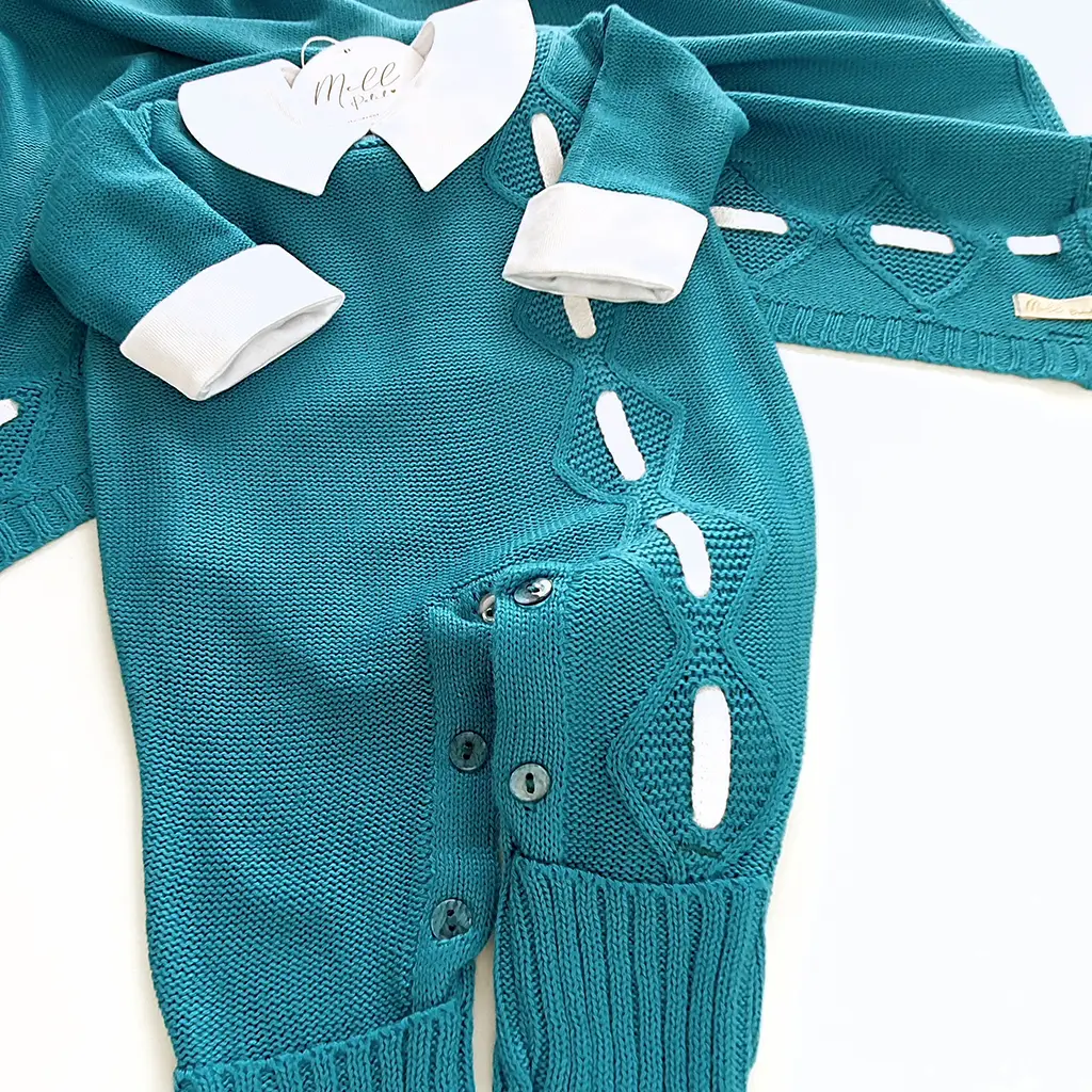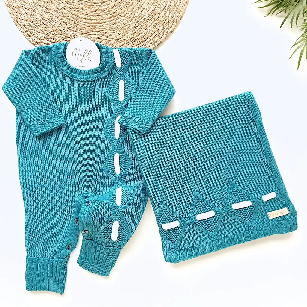 Macacão e manta coordenados com detalhe na trama transpassado. Possui abotoamento nas costas e entre as pernas para facilitar a troca do bebê.