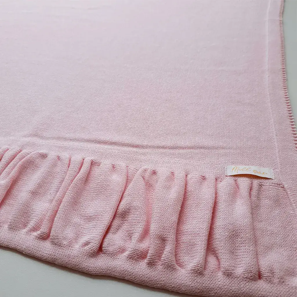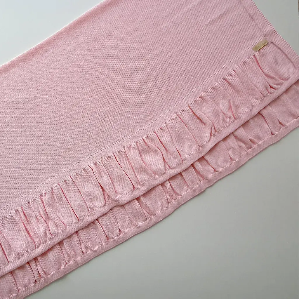 Manta de tricot na cor Rosa bebê drapeada*, medindo aproximadamente: 80 x 80 cm.