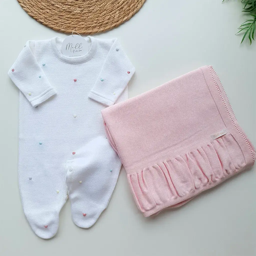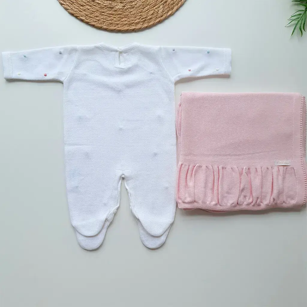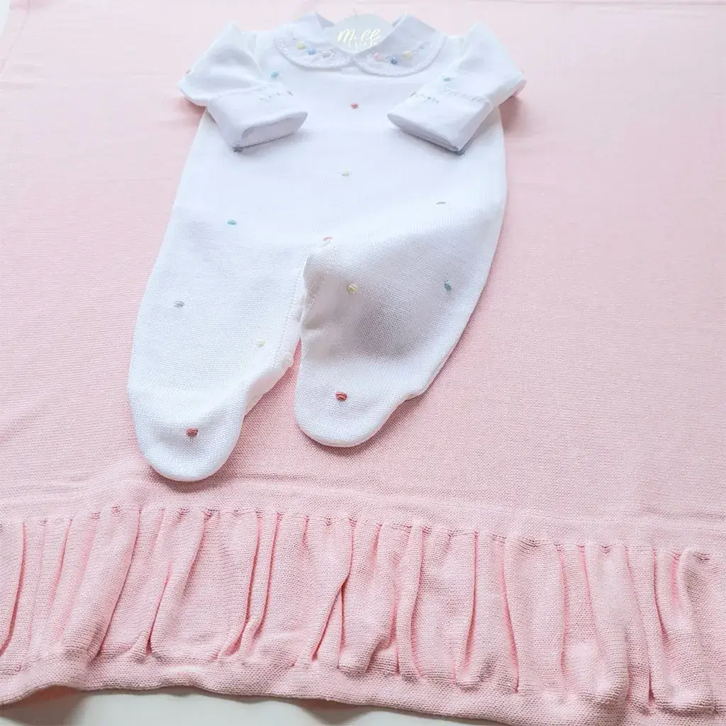 Macacão branco liso bordado manualmente com poá em relevo colorido. Possui abotoamento nas costas e entre as pernas para facilitar a troca do bebê.