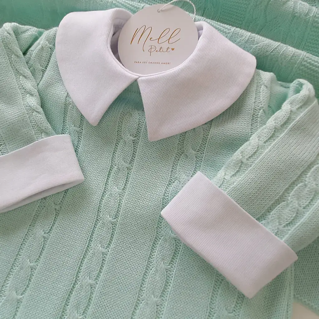 Macacão trama trabalhada no formato de tranças. Possui abotoamento nas costas e entre as pernas para facilitar a troca do bebê.