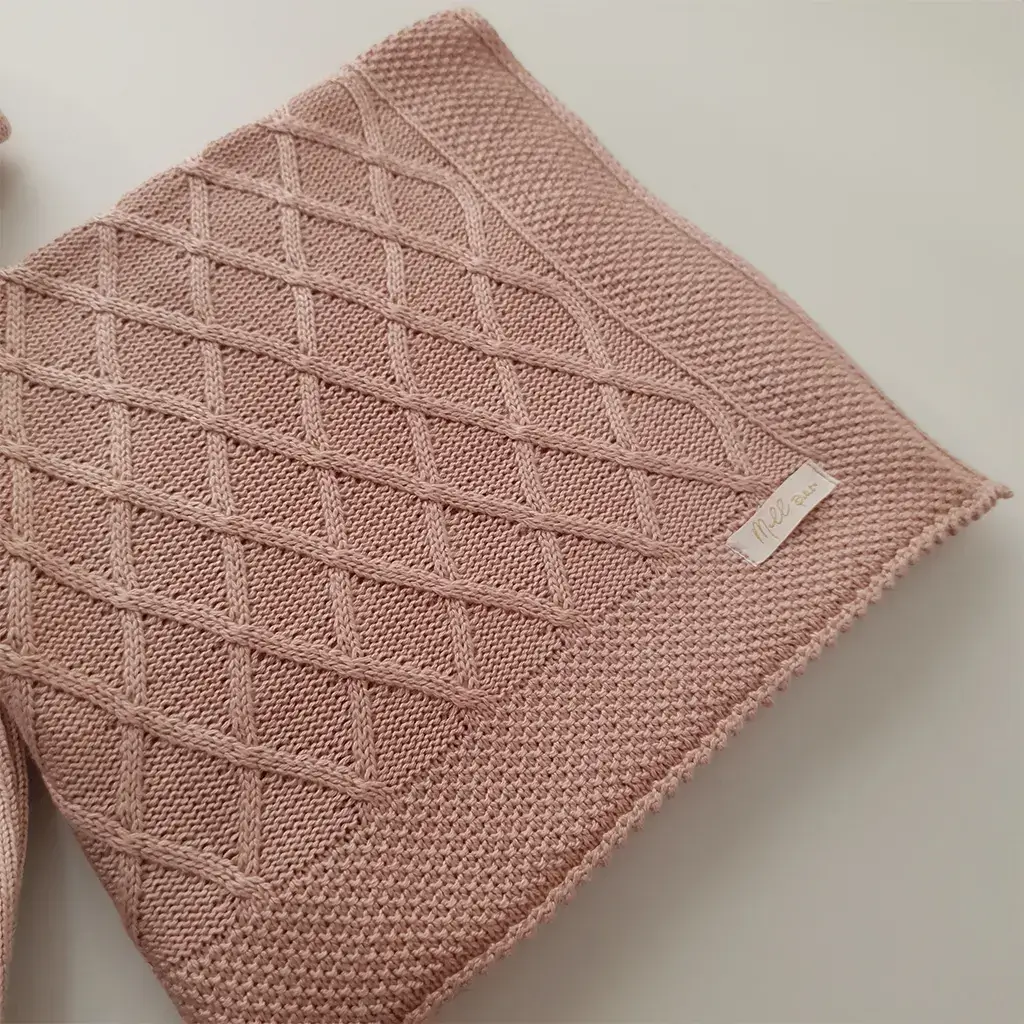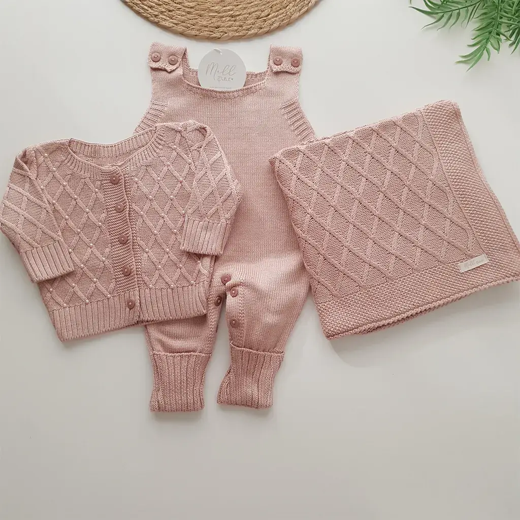 Manta de tricot trabalhada coordenada com o cardigan , medindo aproximadamente: 80 x 80 cm.