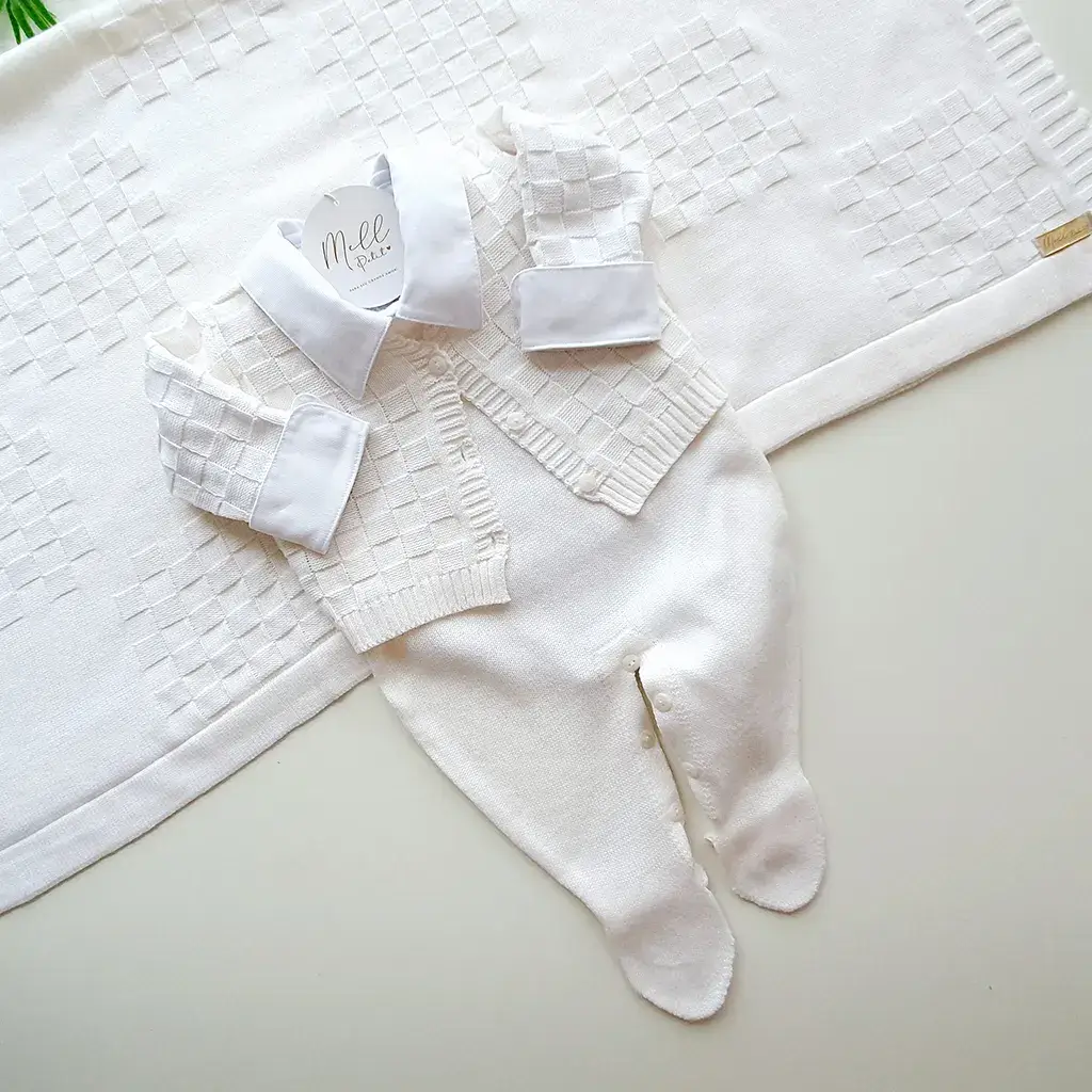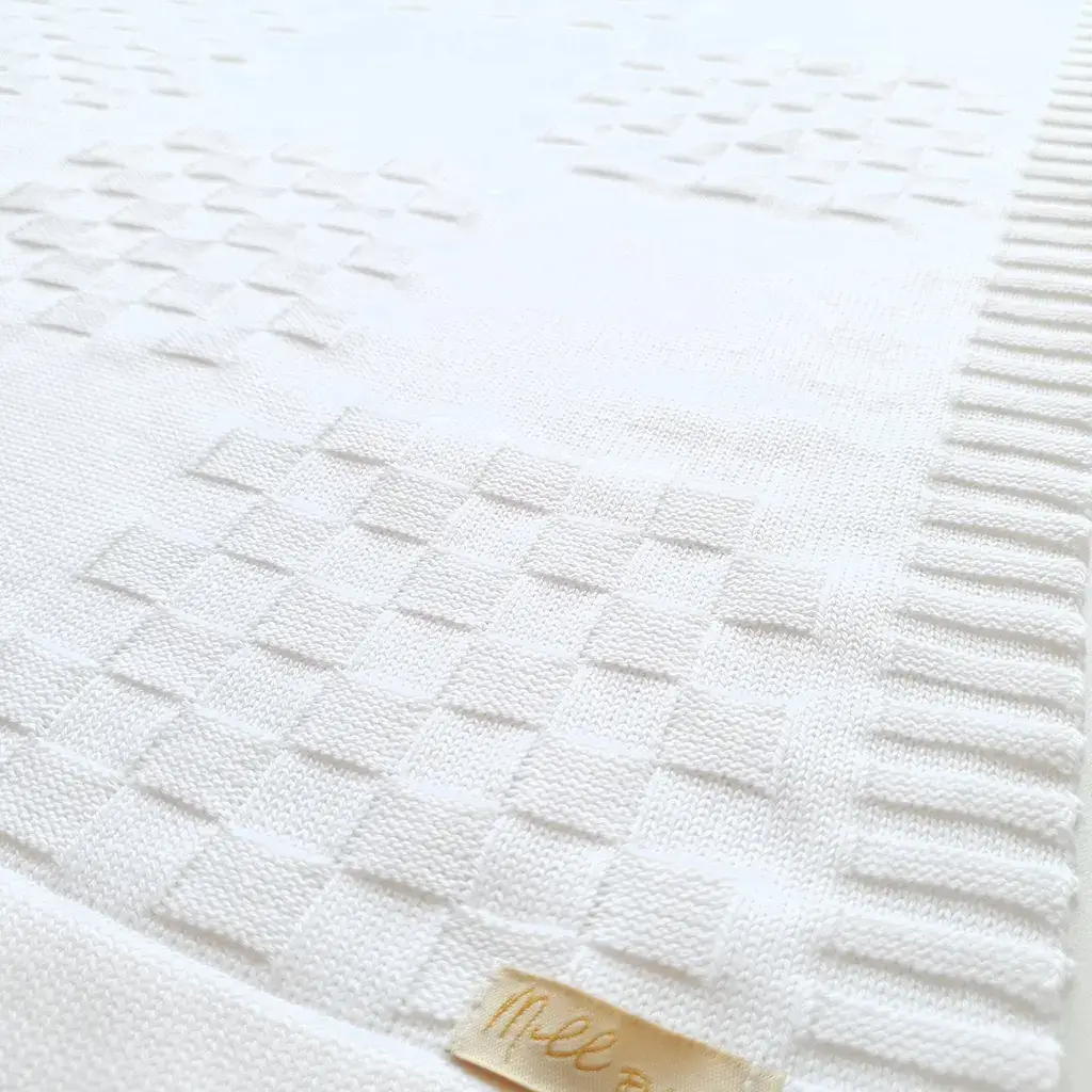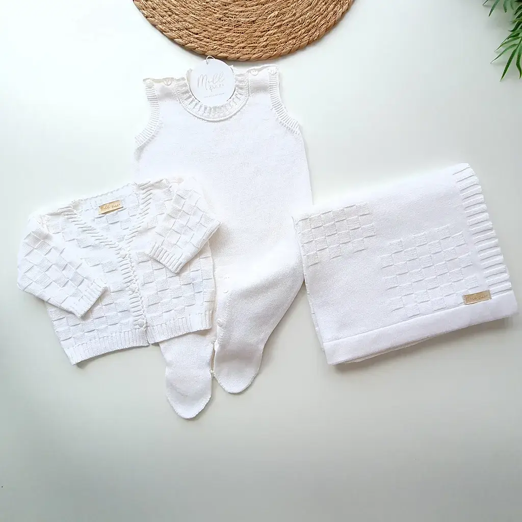 Manta com detalhes na trama estilo tijolinho combinando com o cardigan, medindo aproximadamente 80×80.