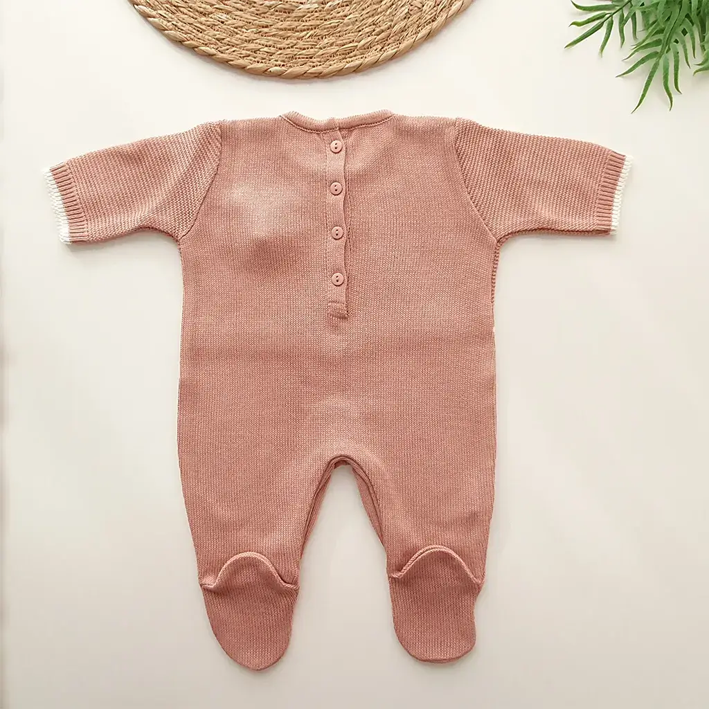 Macacão trama metade trabalhada metade lisa, com laço e aplique. Possui abotoamento nas costas e entre pernas para facilitar a troca do bebê.