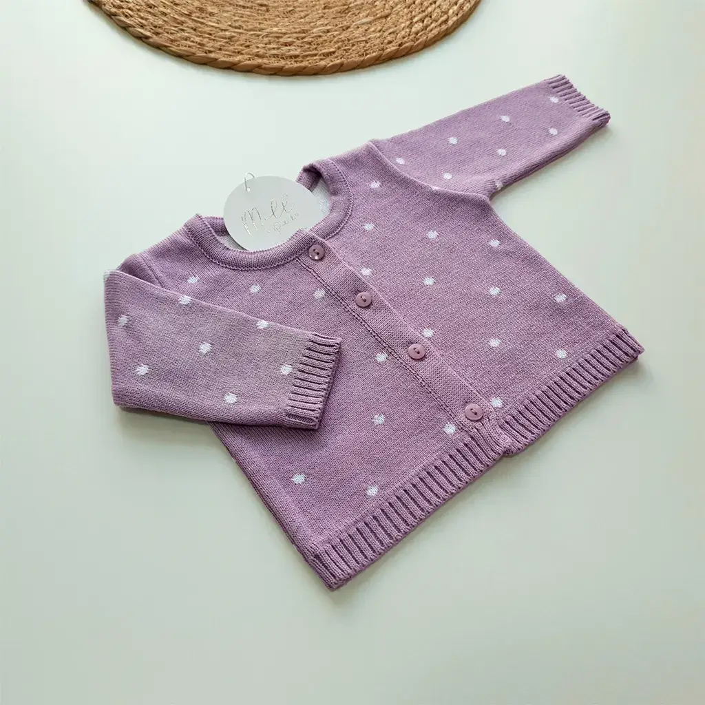 Cardigan na cor lilás em jacquard com poás na cor Branco. Possui botões com abertura frontal