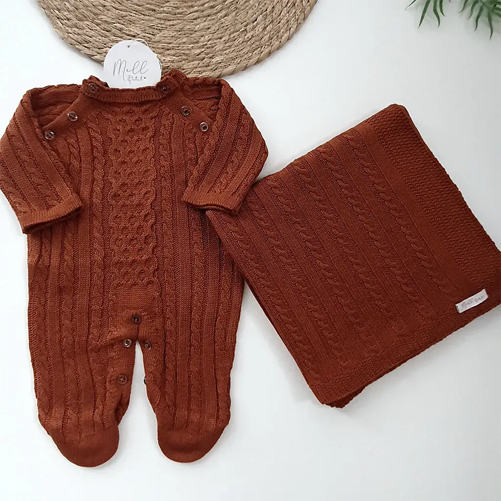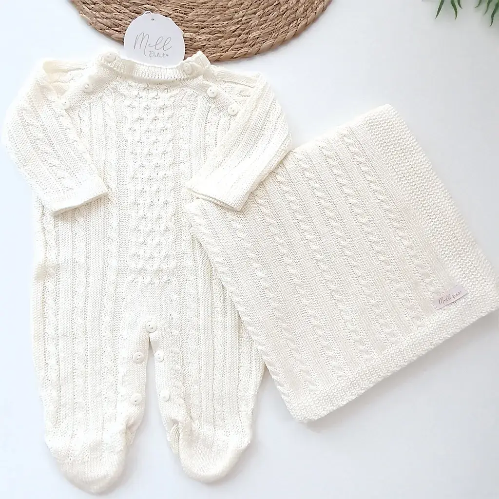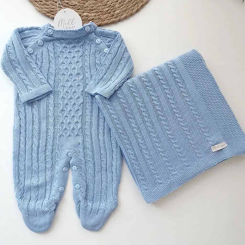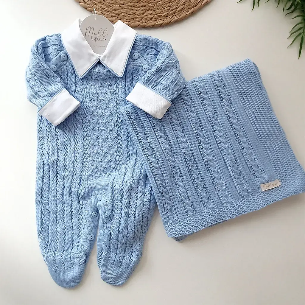 Manta de tricot coordenada com o macacão, medindo aproximadamente: 80 x 80 cm.
