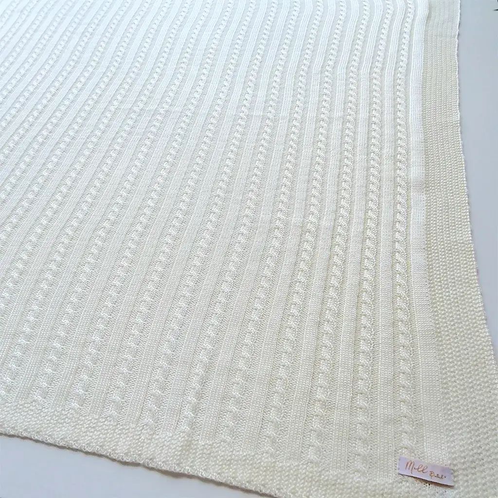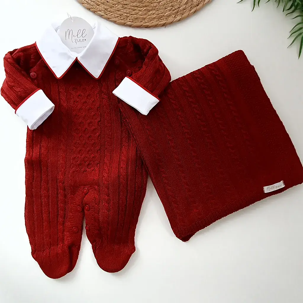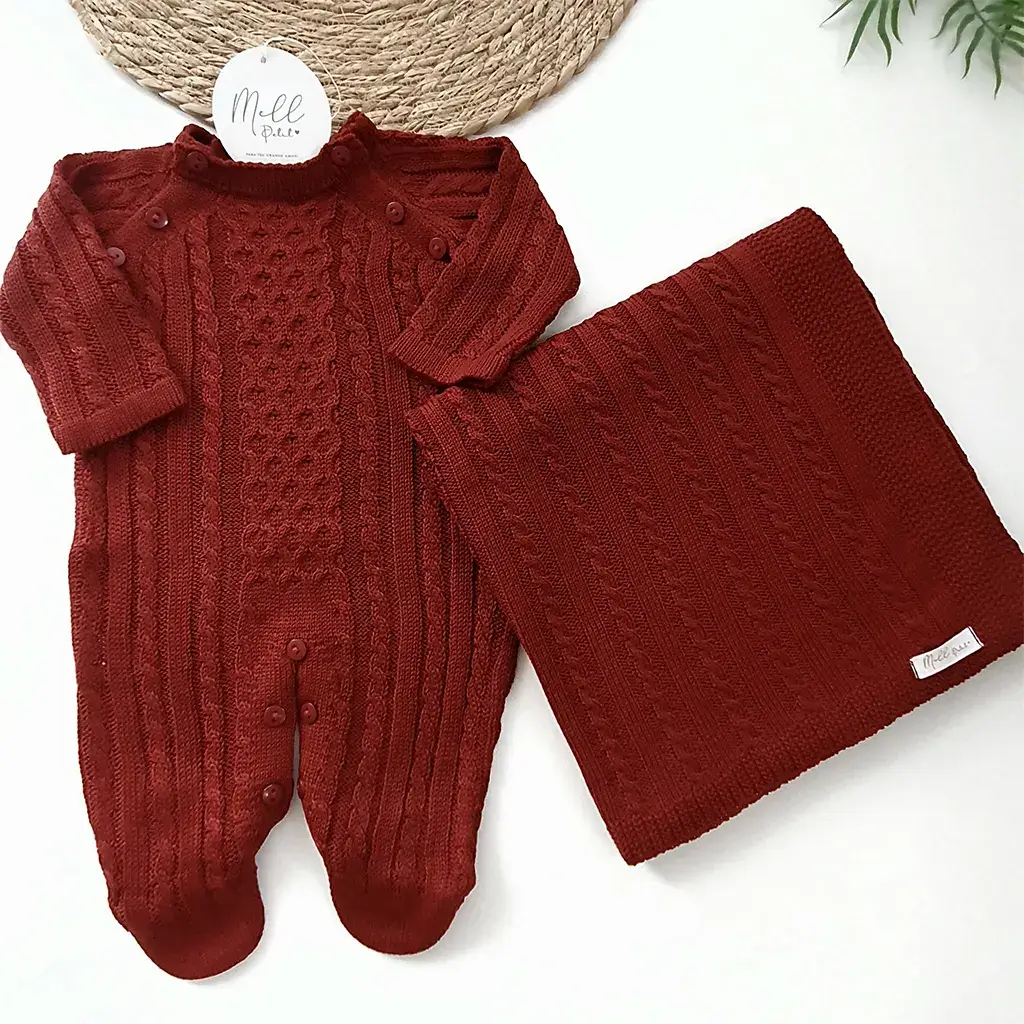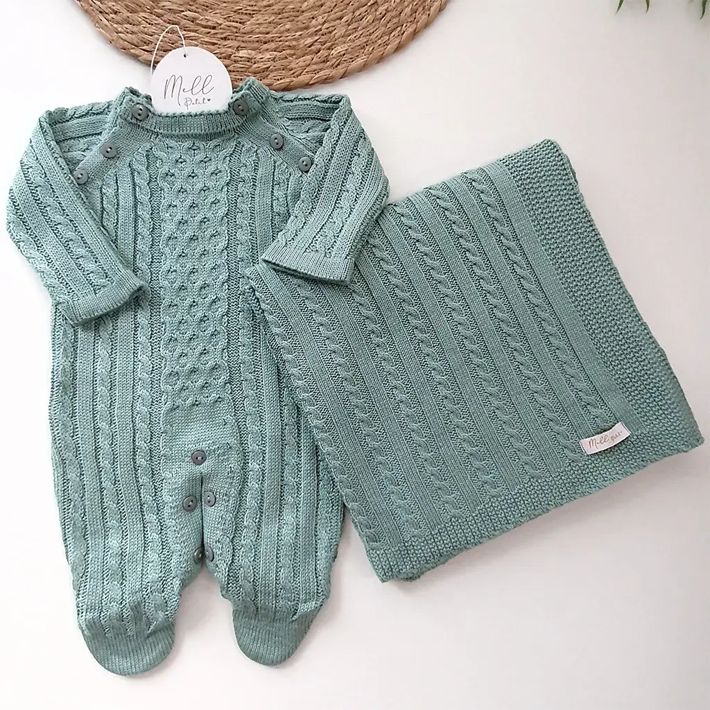 Manta de tricot coordenada com o macacão, medindo aproximadamente: 80 x 80 cm.