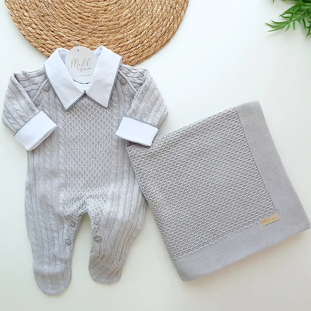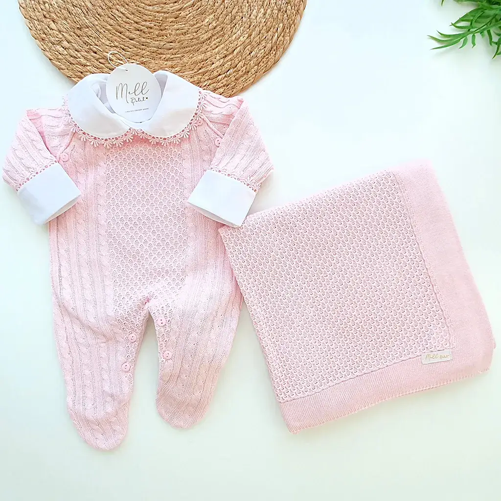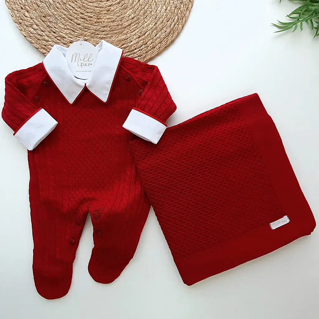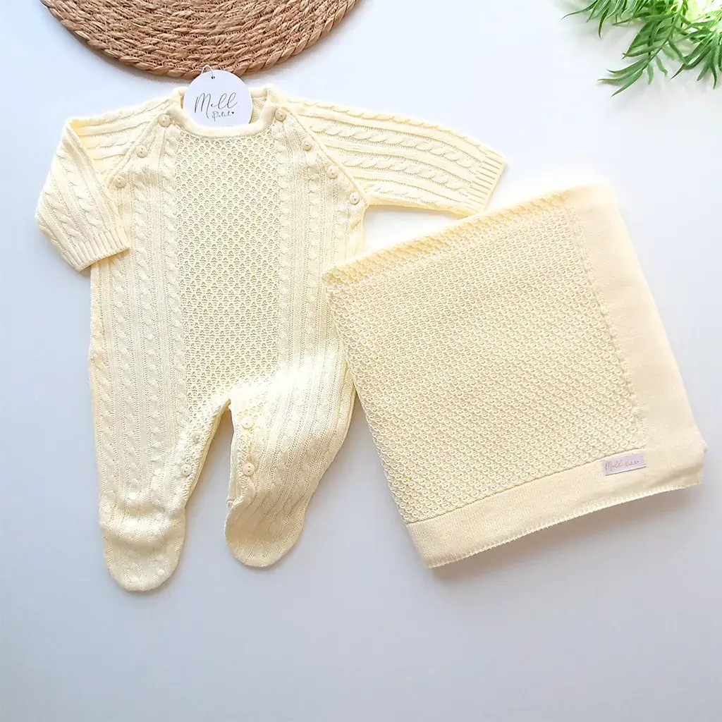 Manta de tricot coordenada com o macacão de mesma cor , medindo aproximadamente: 80 x 80 cm.