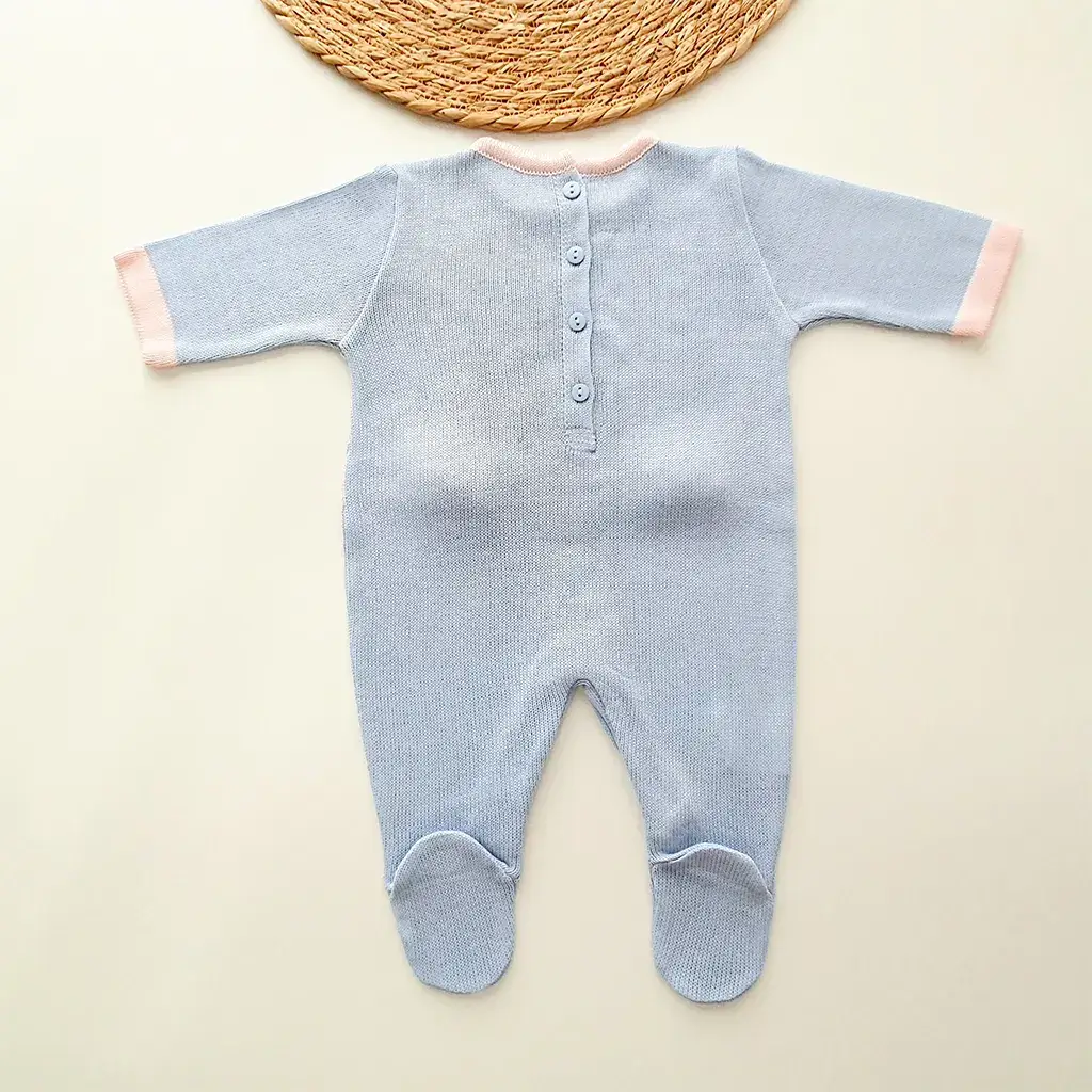 Macacão com detalhe trançado na trama,  apliques e laços em tricot. Possui abotoamento nas costas e entre as pernas para facilitar a troca do bebê.
