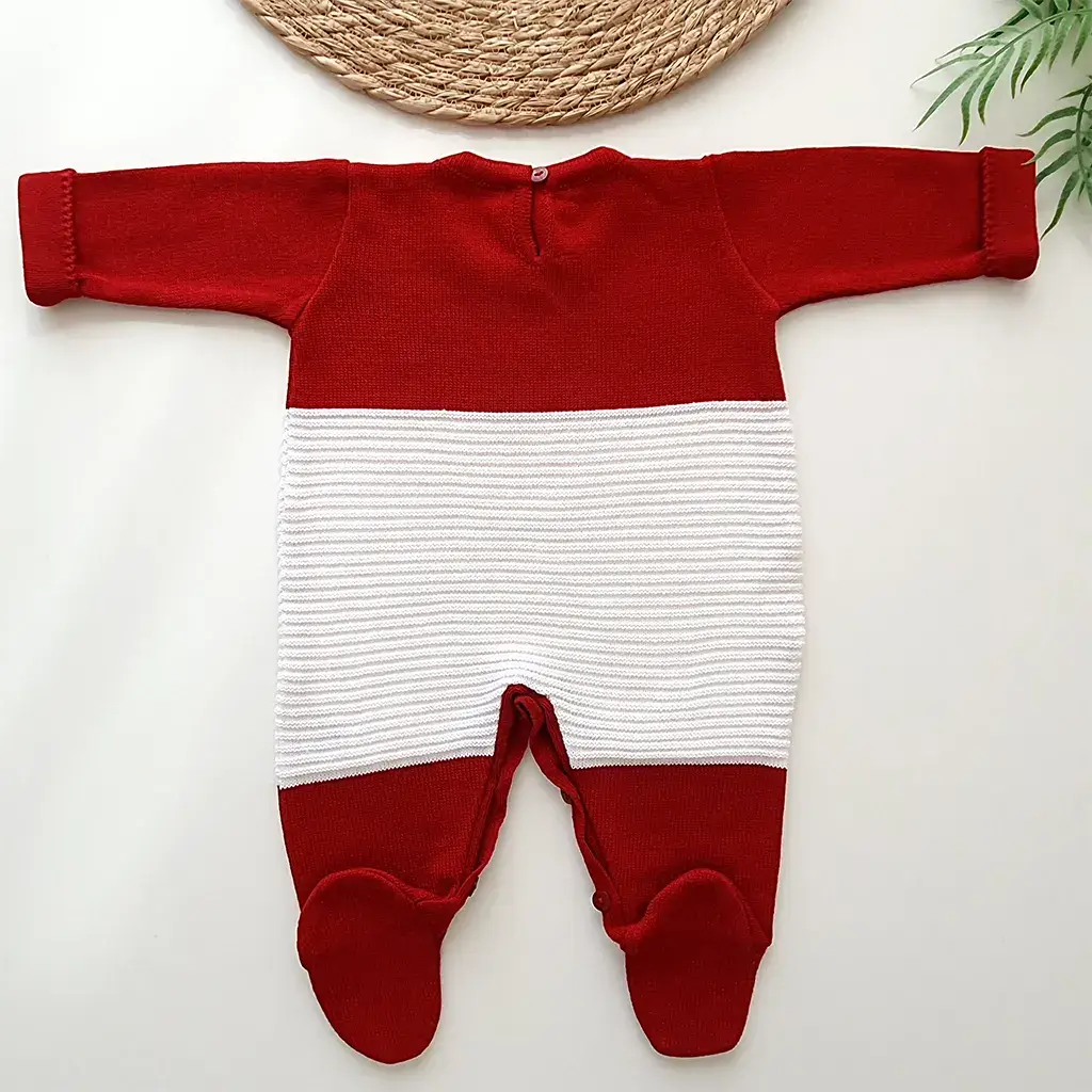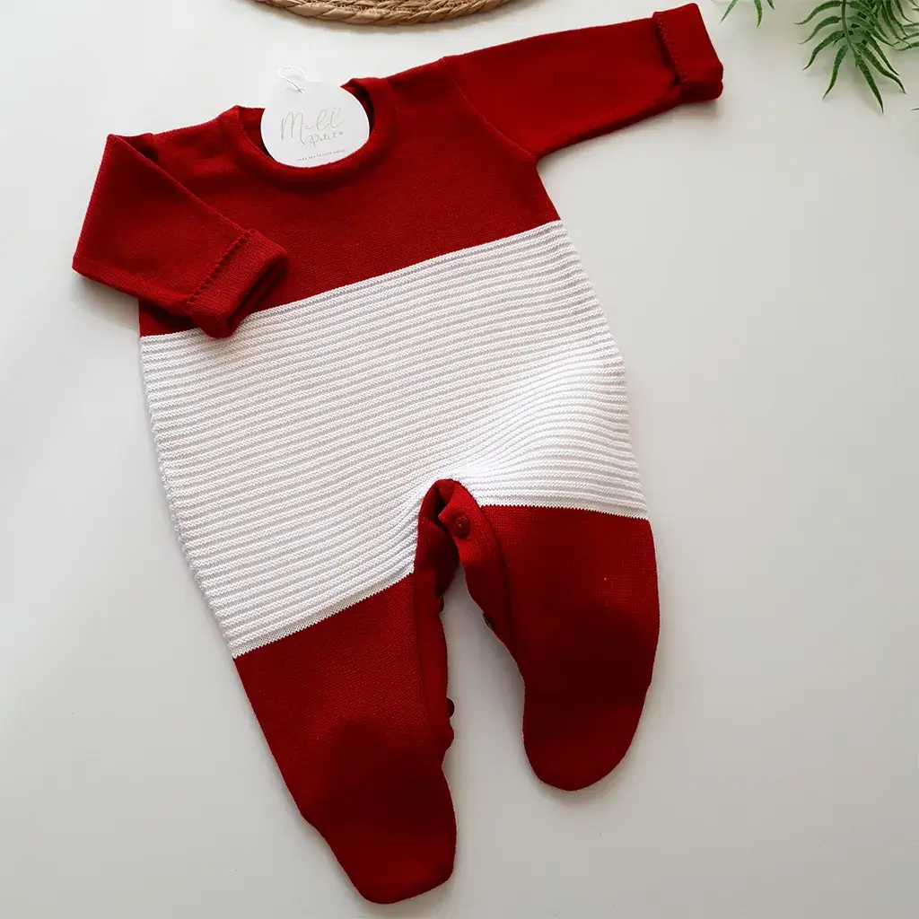 Macacão na cor vermelho possui detalhe canelado na trama na cor branca.