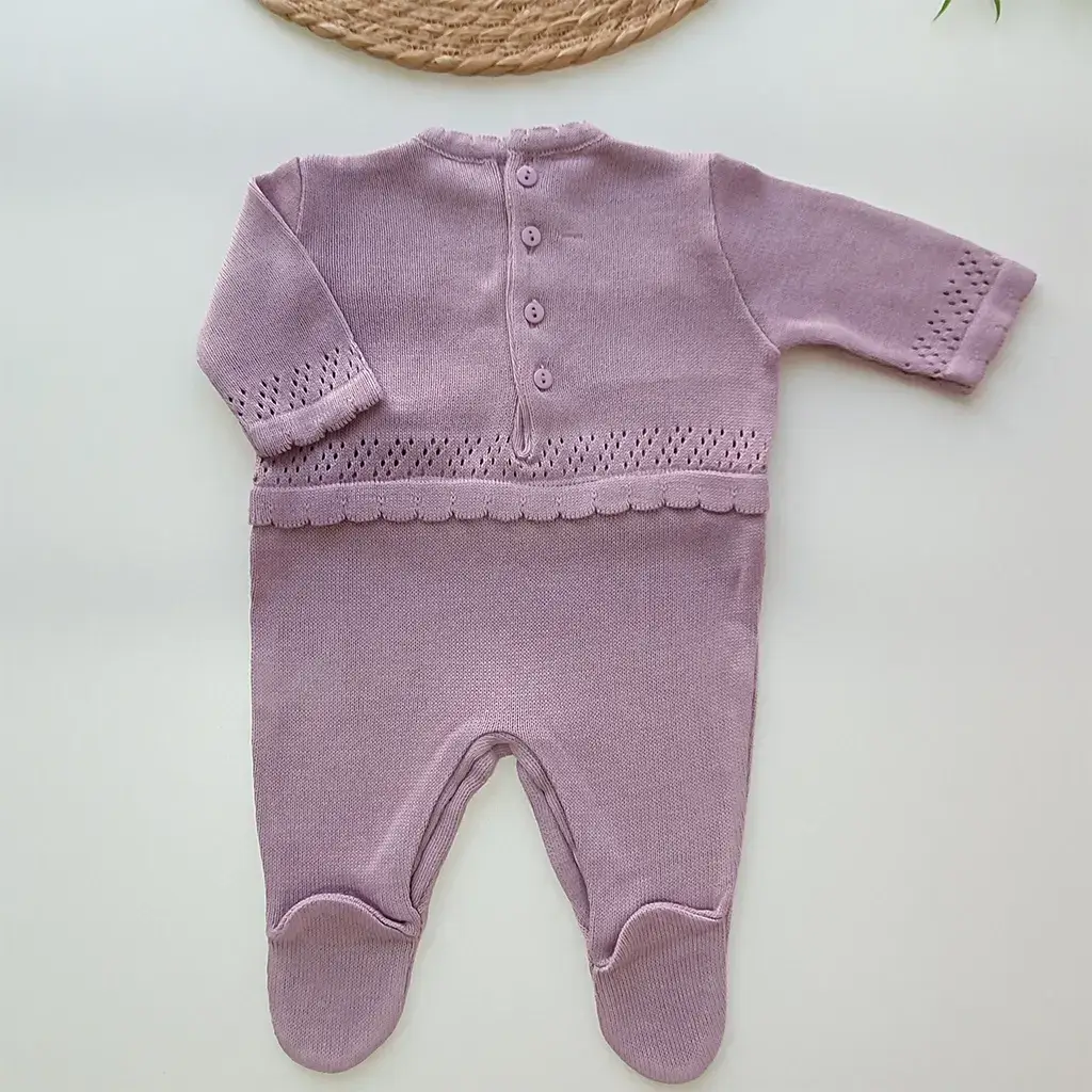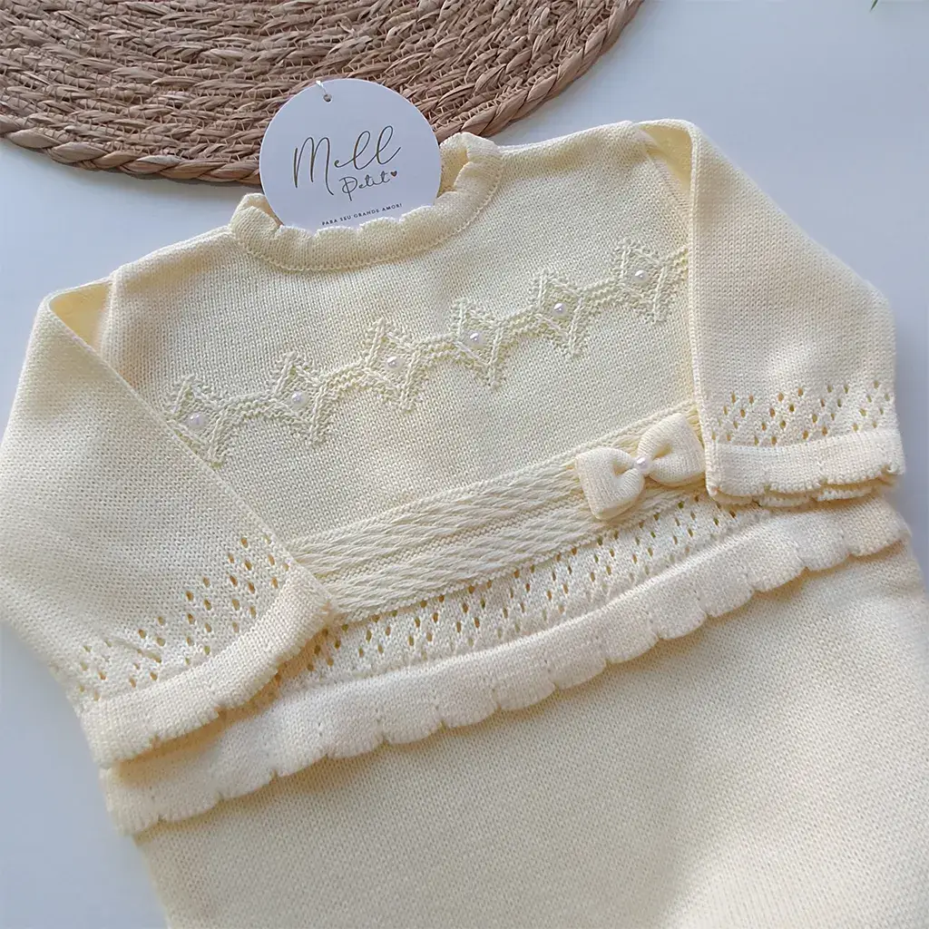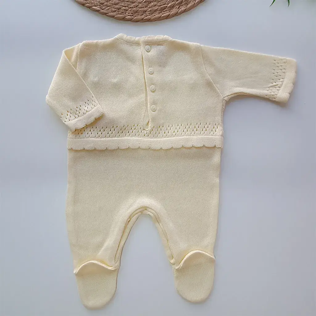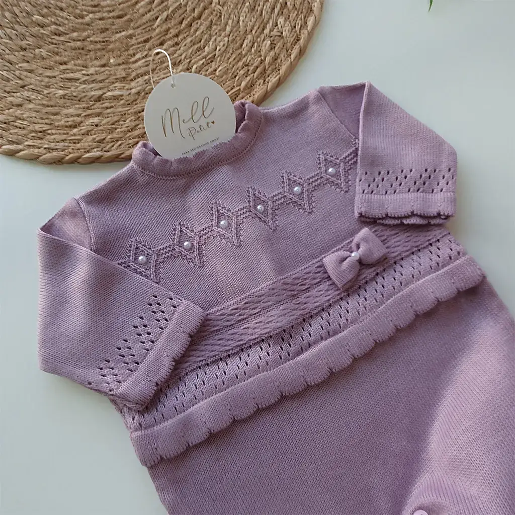 Macacão em  tricot trama trabalhada com detalhes em mini pérolas e laço. Possui abotoamento nas costas e entre as pernas para facilitar a troca do bebê.