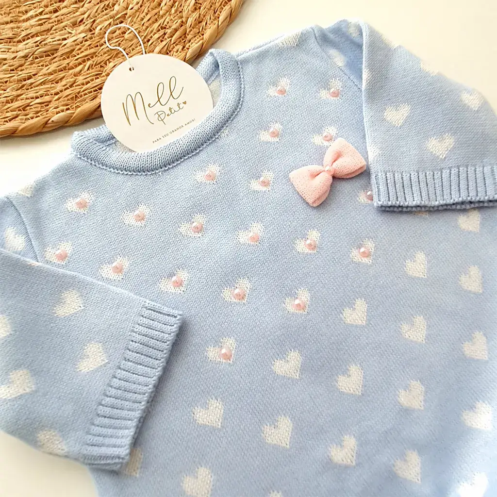 Macacão em tricot jacquard azul desenho de corações na cor branca na trama, apliques e laço. Possui abotoamento nas costas e entre as pernas para facilitar a troca do bebê.