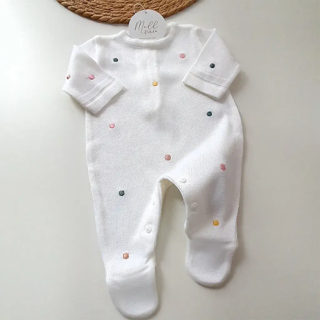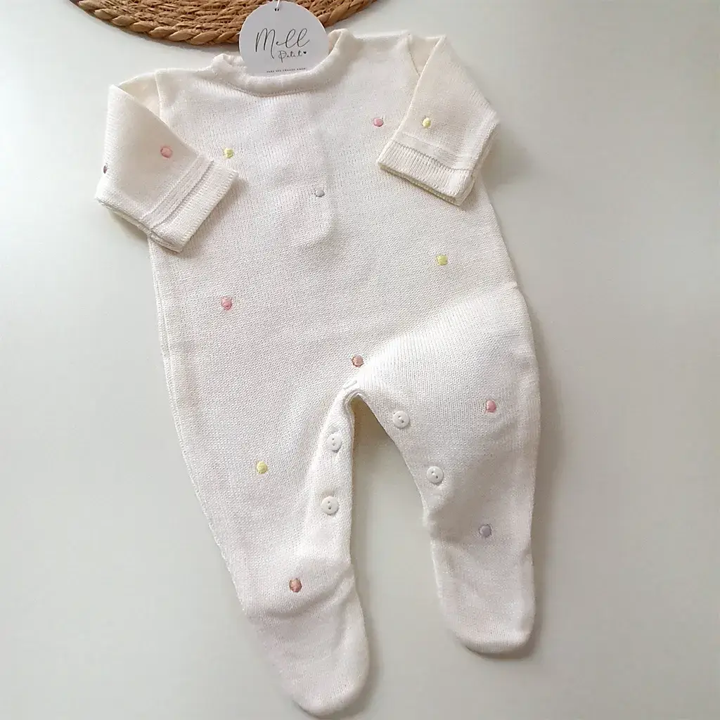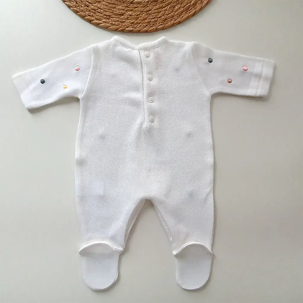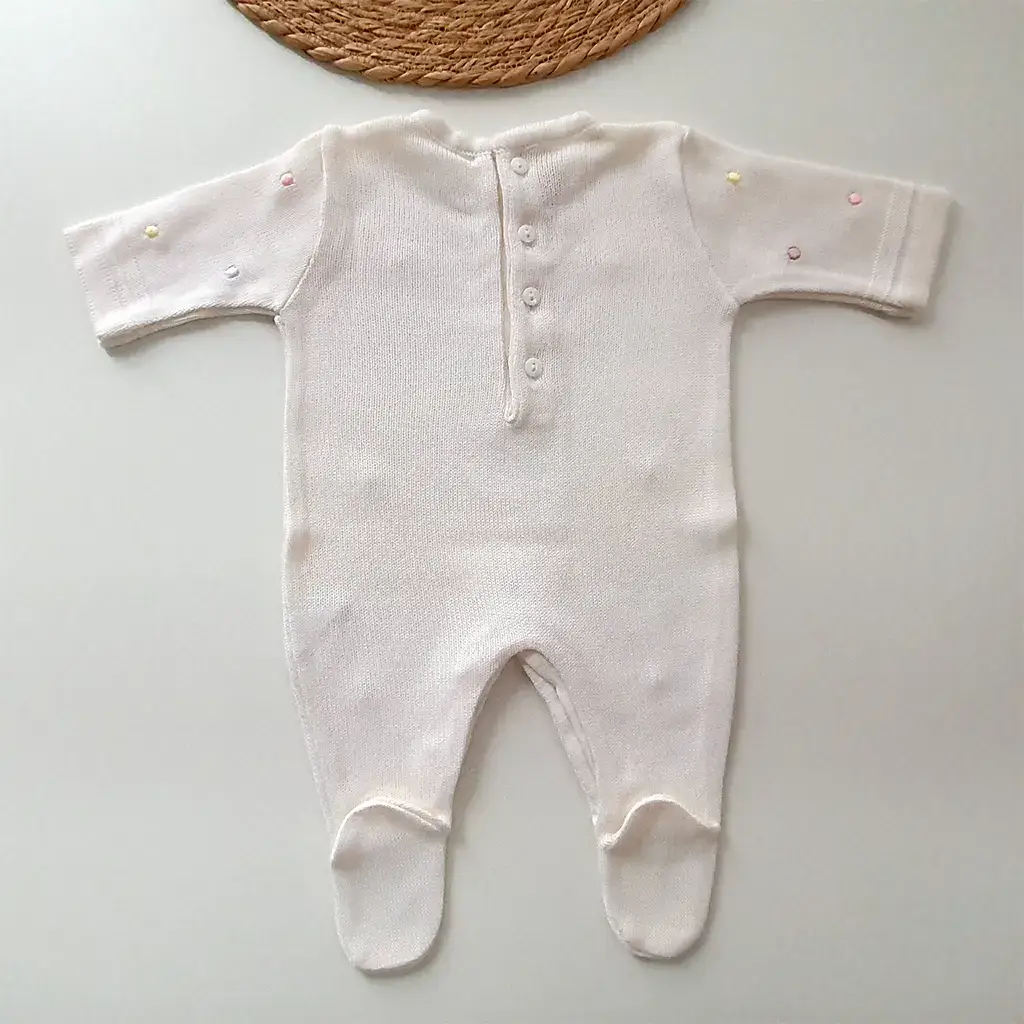 Macacão liso bordado manualmente com poá em relevo colorido. Possui abotoamento nas costas e entre as pernas para facilitar a troca do bebê.