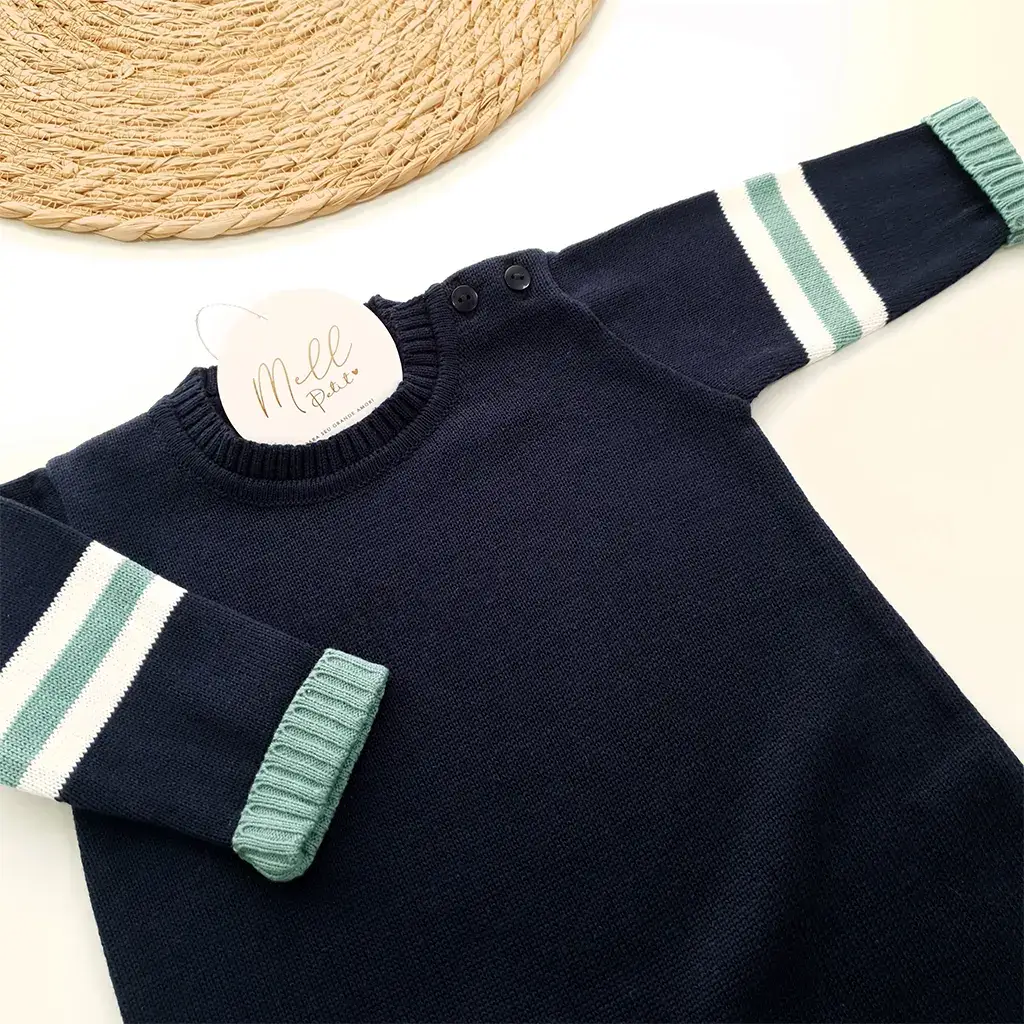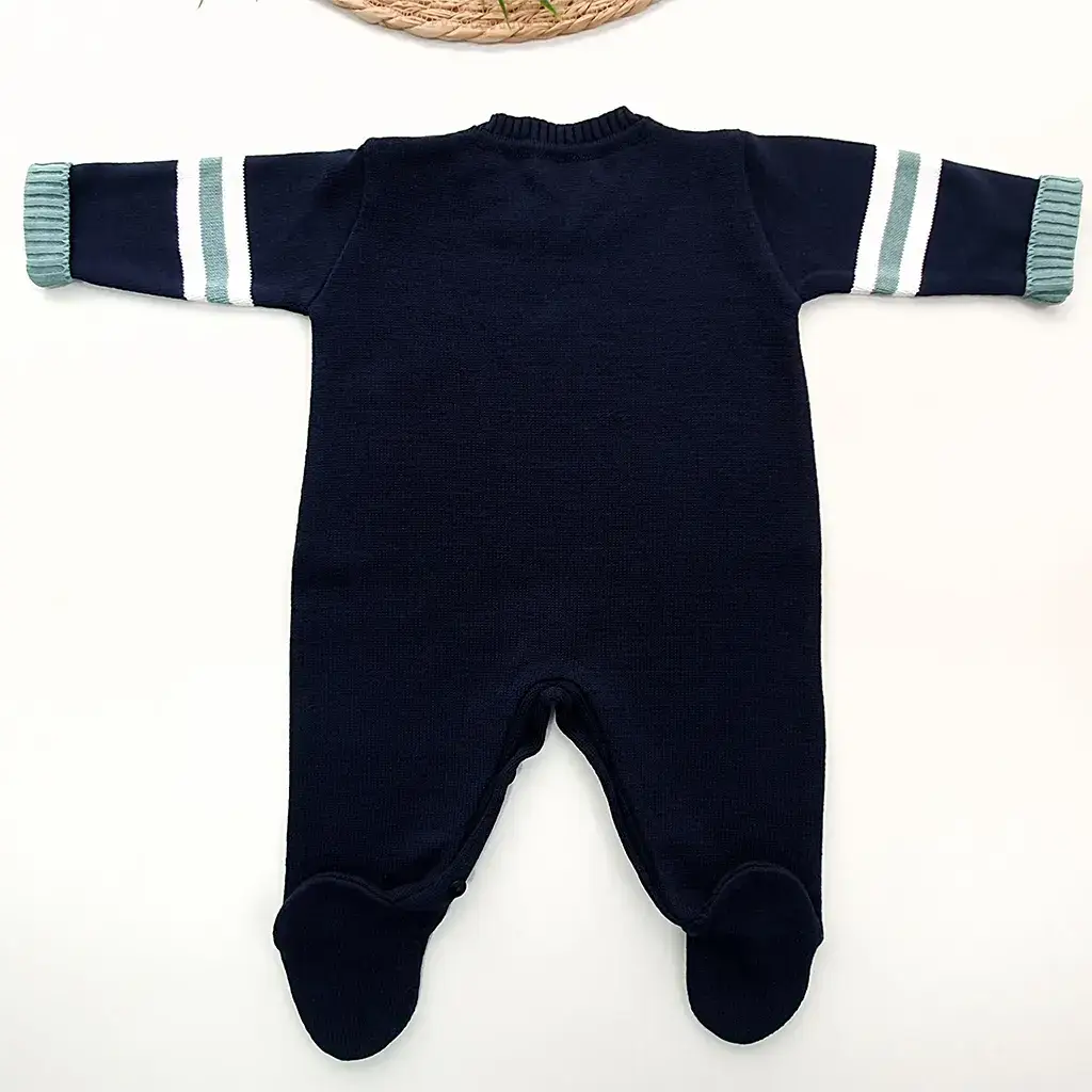 Macacão  com botões em um dos ombros e listrado nos braços. Possui abotoamento nas costas e entre as pernas para facilitar a troca do bebê.