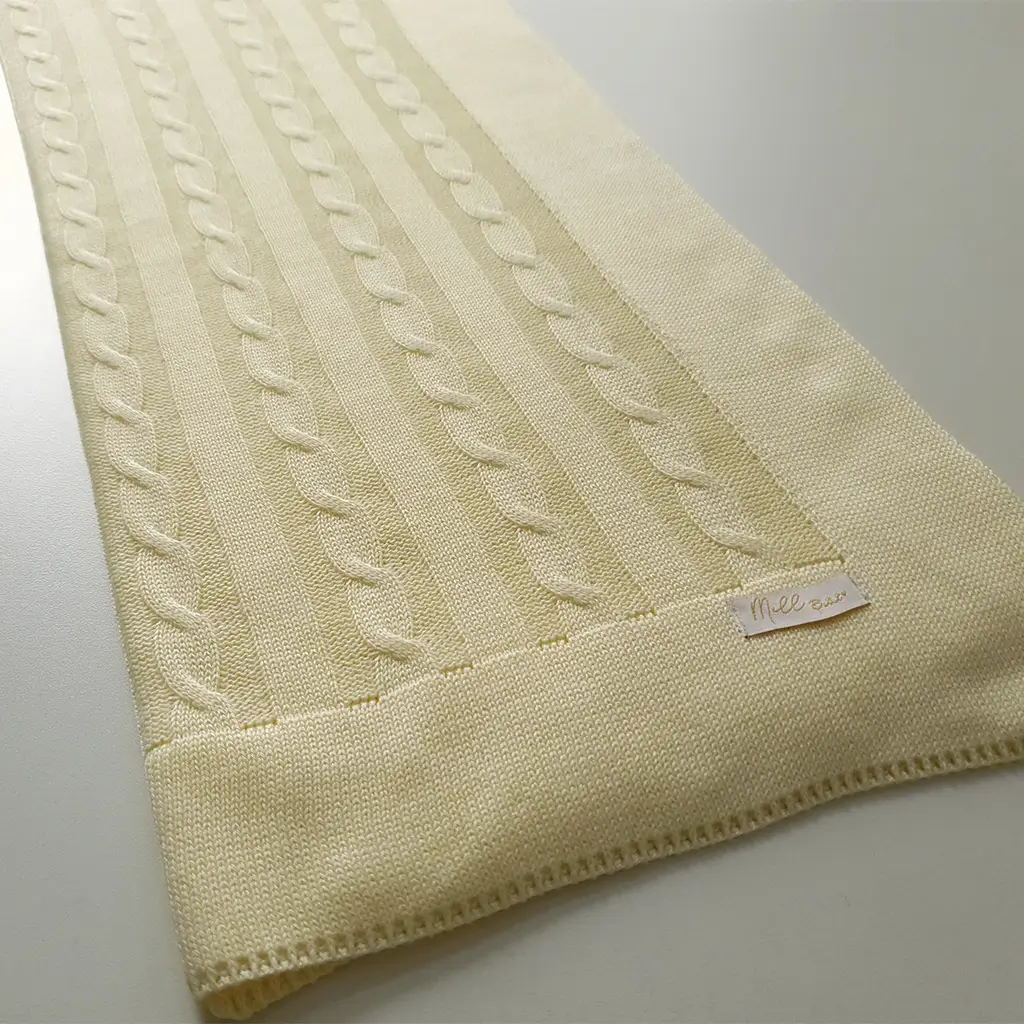 Manta de tricot antialérgico trama no formato trançado de corda, envolve o bebê com muito conforto. Sendo perfeito para qualquer época do ano, deixando um toque macio em cada peça.