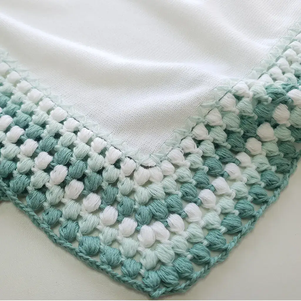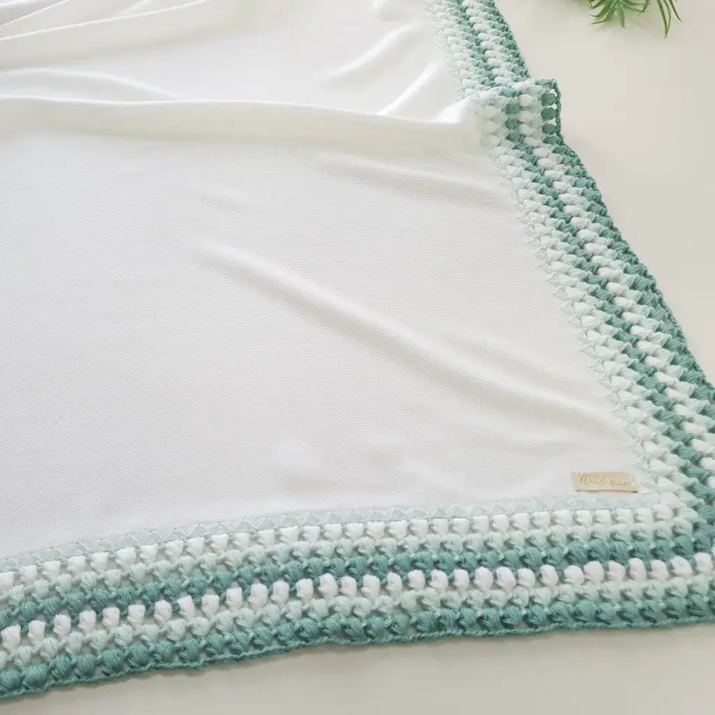Manta confeccionada em tricot anti alérgico, envolve o bebê com muito conforto, mantendo aquecido. O acabamento artesanal do barrado em crochê no ponto pipoca destaca a sofisticação da peça. Perfeita para combinar com nossas saídas maternidades ou para compor um kit através de peças avulsas.
