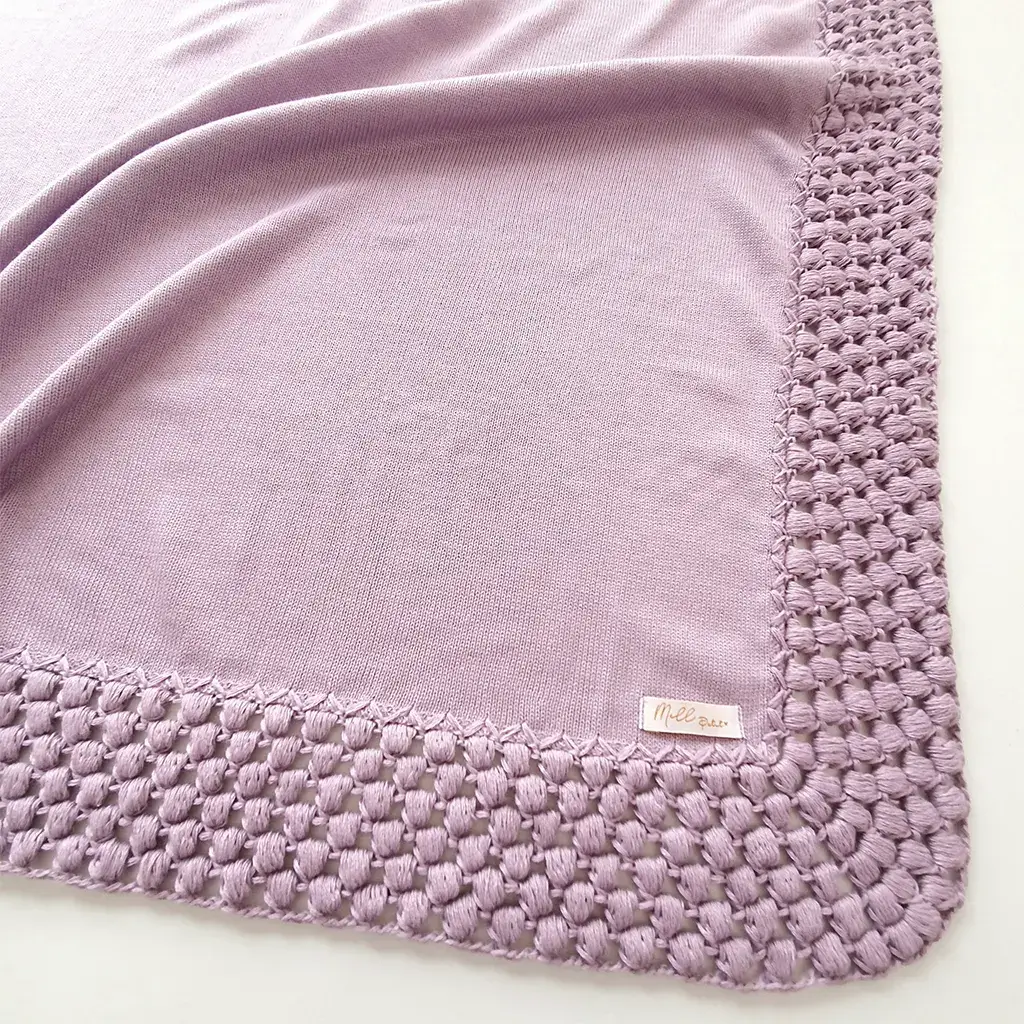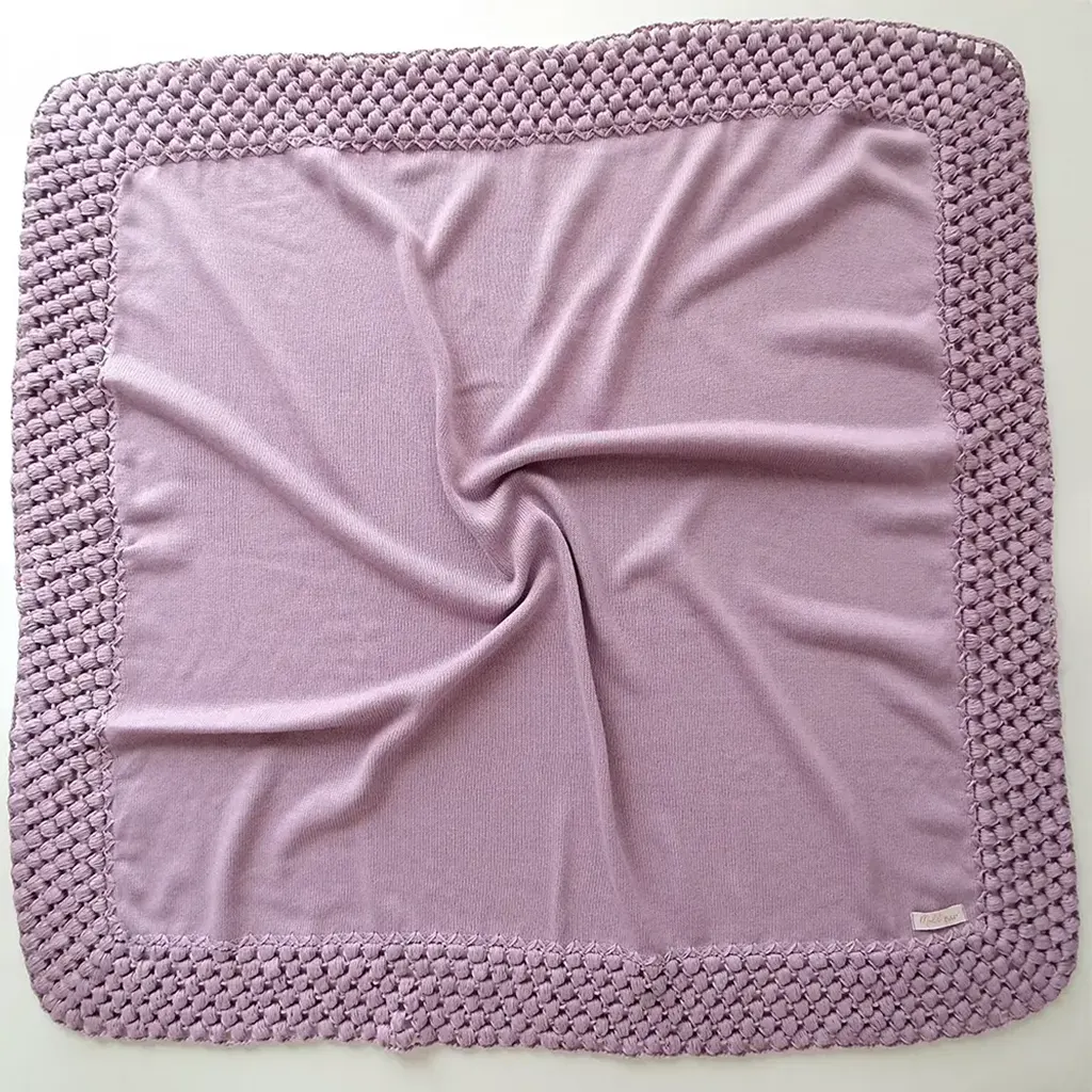 Manta confeccionada em tricot anti alérgico, envolve o bebê com muito conforto. O acabamento artesanal do barrado em crochê no ponto pipoca destaca a sofisticação da peça. Perfeita para combinar com nossas saídas maternidades ou para compor um kit através de peças avulsas.