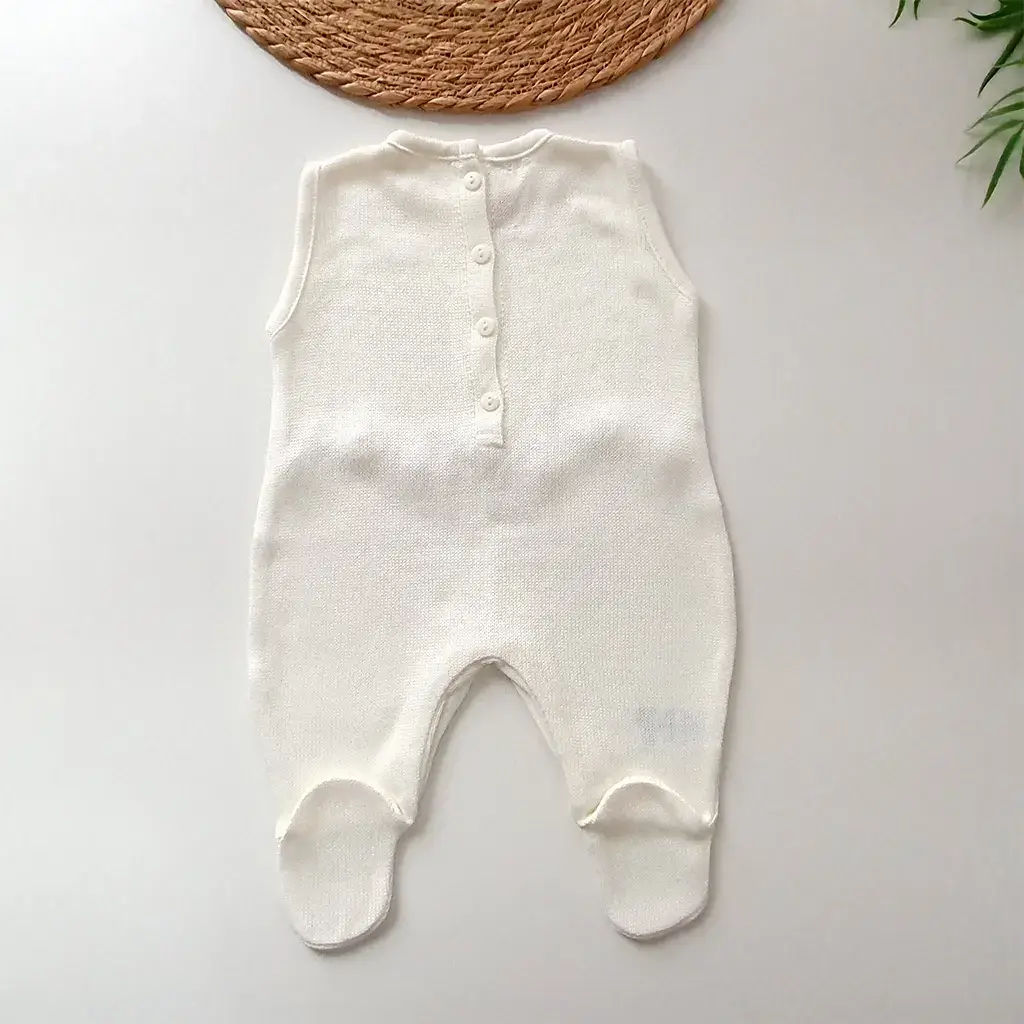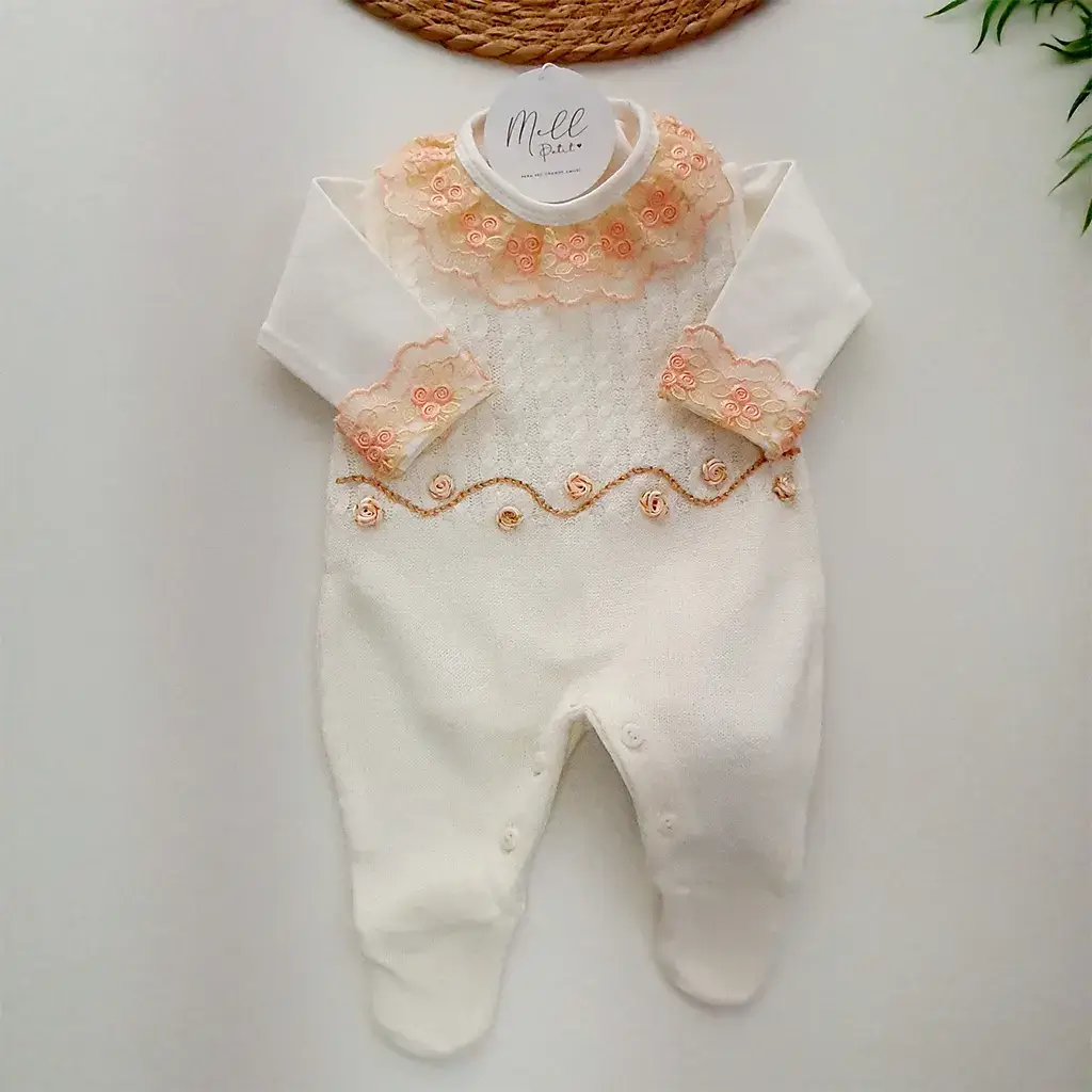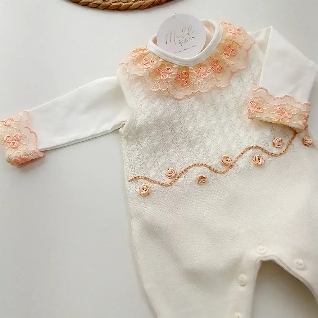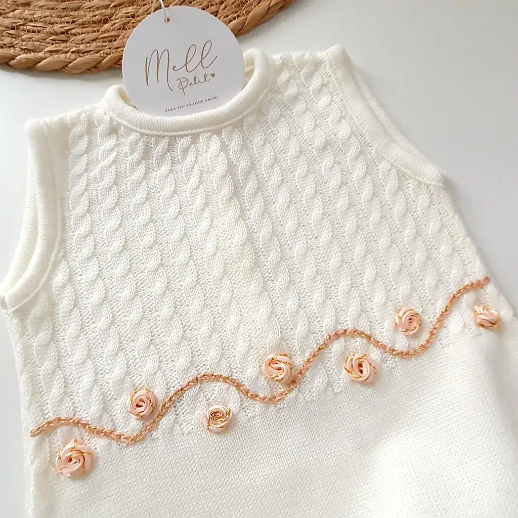 Salopete trama lisa e trabalhada no formato de corda com detalhes de rosas. Possui abotoamento nas costas e entre pernas para facilitar a troca do bebê.