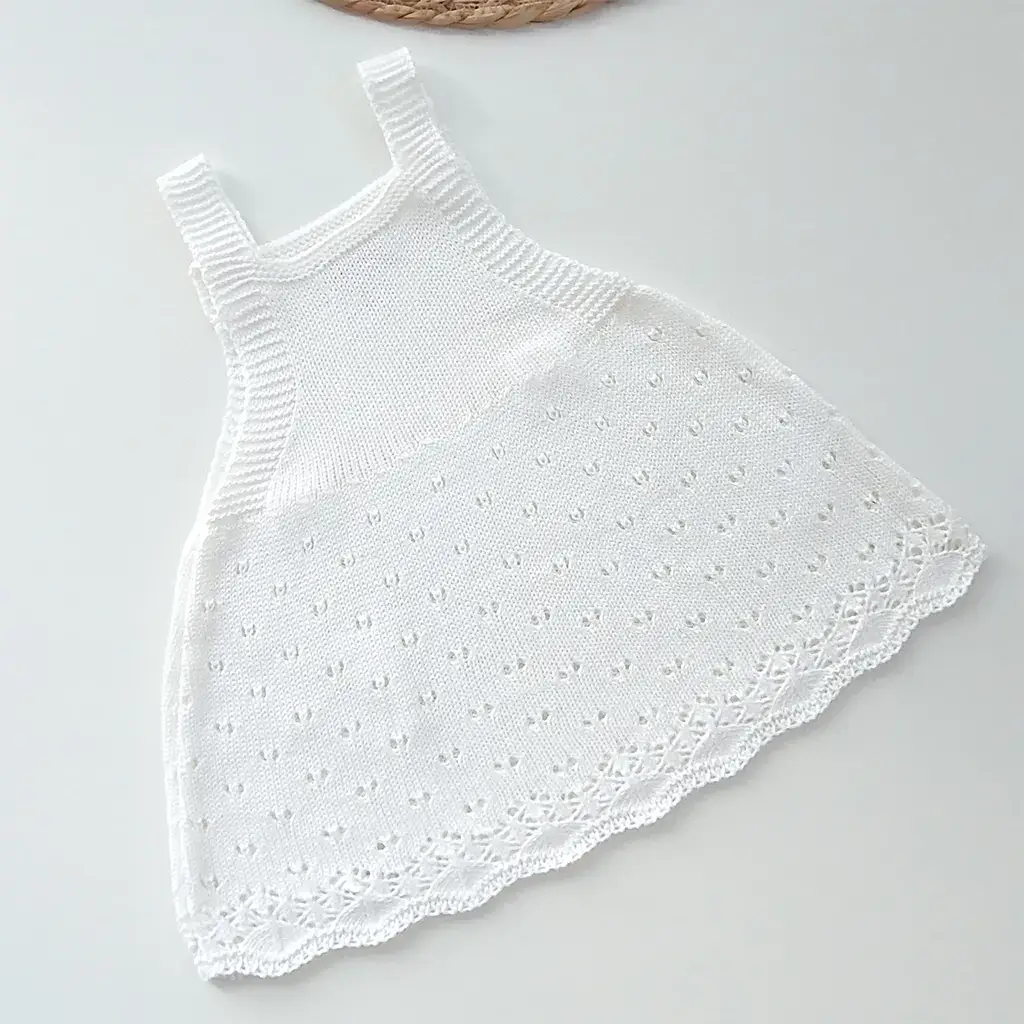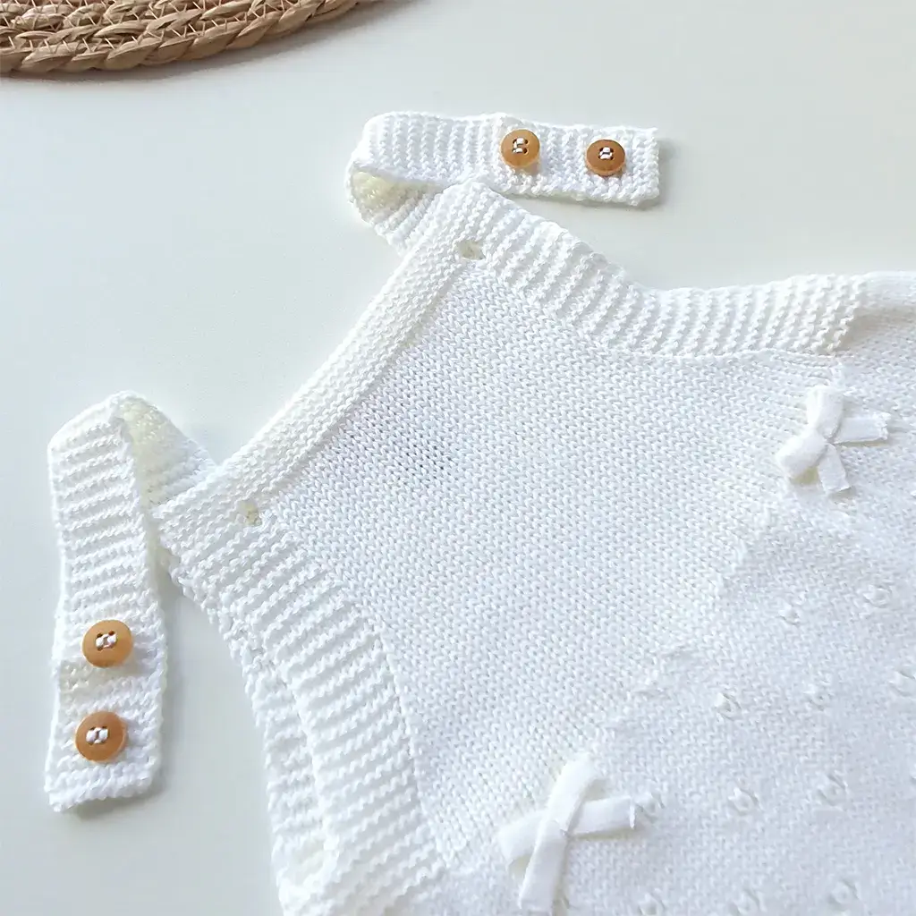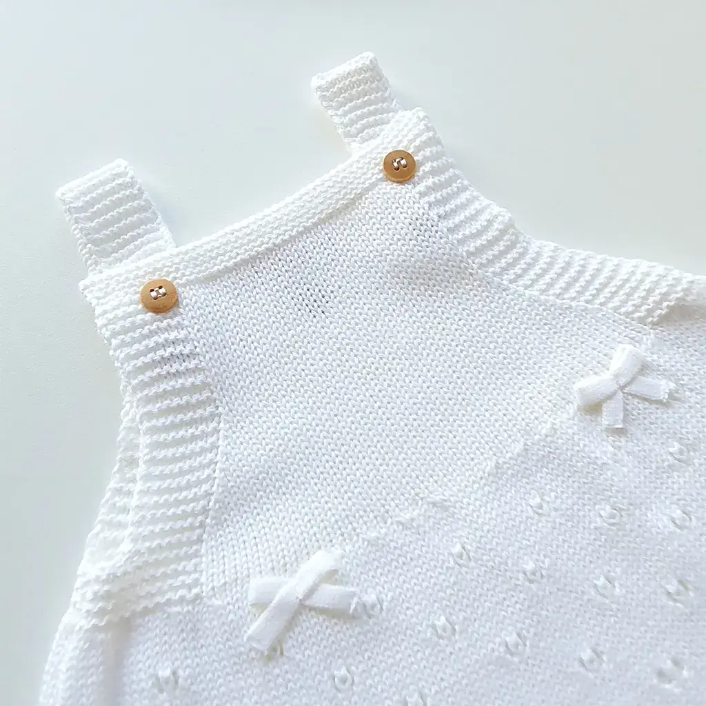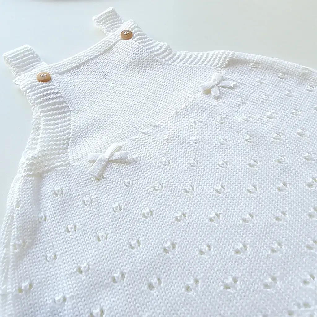 Vestido com trama trabalhada com laço. Possui abotoamento pelos ombros para facilitar a troca da bebê.